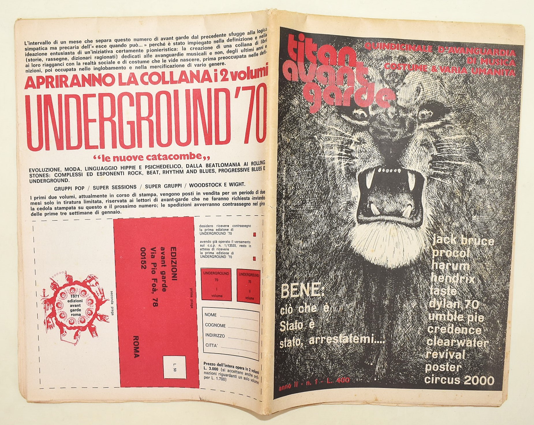 Titan Avant-Garde. Quindicinnale d'Avanguardia di musica di costume & varia umanità. Anno II / 1 (1971) Carmelo Bene - Jack Bruce - poster doppio Circus 2000