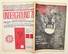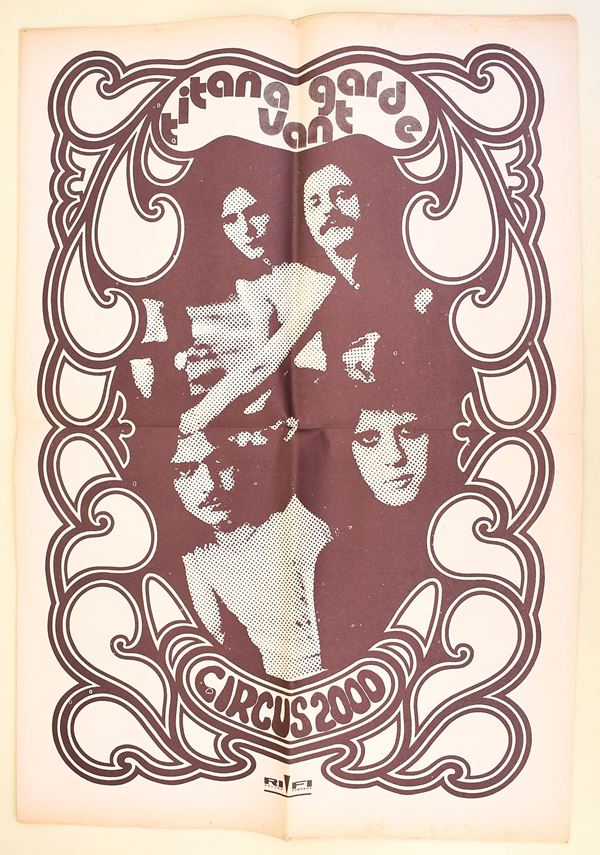 Titan Avant-Garde. Quindicinnale d'Avanguardia di musica di costume & varia umanità. Anno II / 1 (1971). Jack Bruce, Procol, Harum, Hendrix, Taste, Dylan 70, Umble Pie, Credence, Clearwater, Revival, Poster, Circus 2000. Rivista diretta da Renato Mariotti. Rivista contenente poster. Lievi difetti. Rivista originale del 1971. 32 pagine stampate in nero e a colori. Grande poster a doppia pagina al centro della rivista raffigurante Circus 2000. Dimensioni: 43x32 cm ca. Si presenta ripiegata in 2 con doppie copertine. Ottimo stato di conservazione.