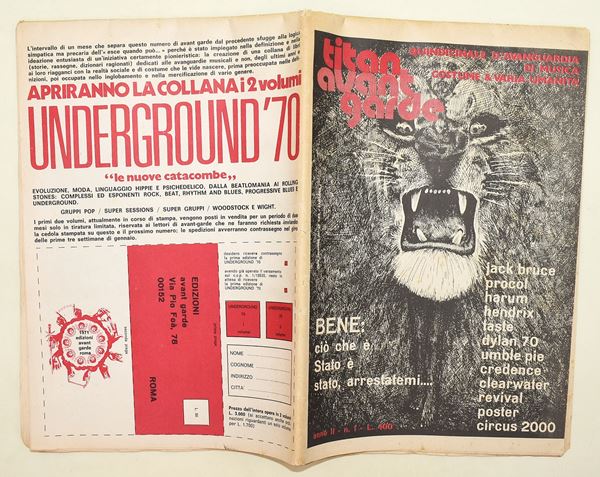 Rivista di taglio sperimentale e controculturale, dedicata a musica, nuove tendenze, società e ricerca artistica. Numero appartenente al secondo anno di pubblicazione. Esemplare raro, non comune sul mercato. Secondo Stampa Musicale, Titan Avant Garde era un quindicinale “d’avanguardia, di musica, costume & varia umanità”. È stato spesso definito come il “Melody Maker italiano”, indicando che era una rivista musicale alternativa, culturale e di controcultura.