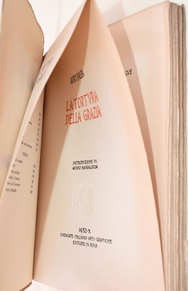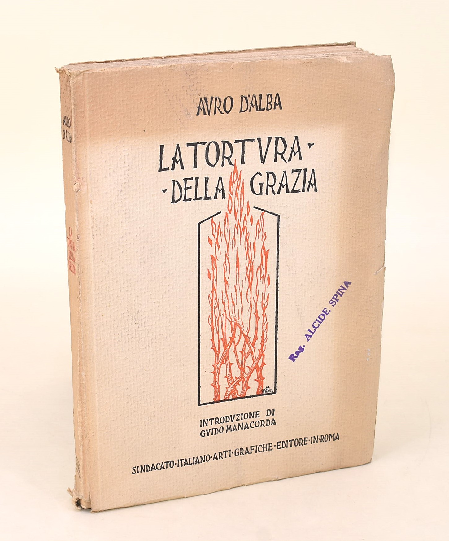 D'Alba, Auro: La tortura della grazia. Introduzione di Guido Manacorda. Sindacato Italiano Arti Grafiche Editore in Roma, 1932-X. Esemplare intonso con xilografie originali all'interno. Brossura. Timbro biblioteca privata.