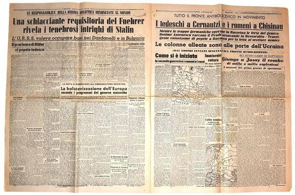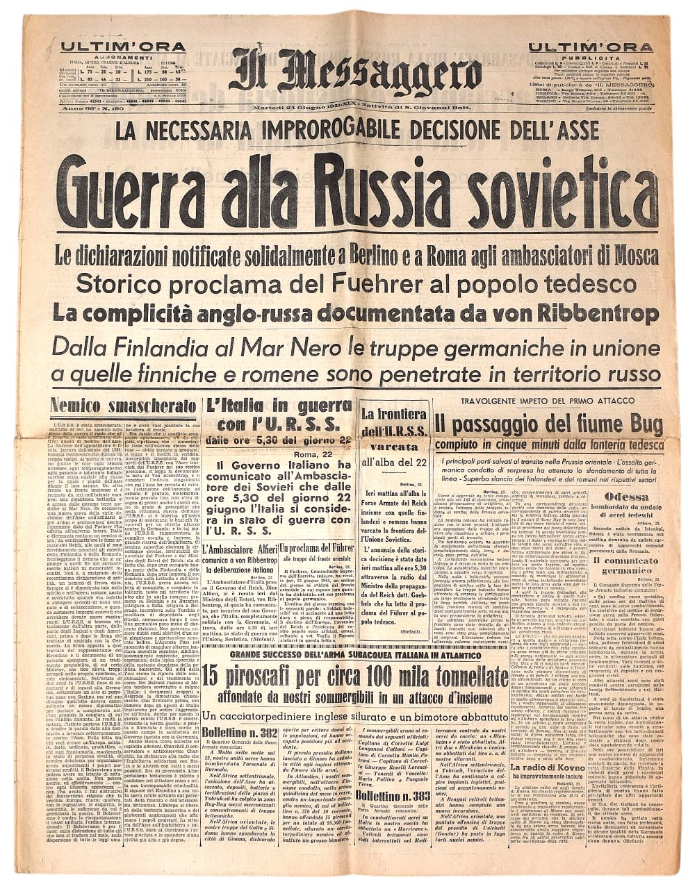 Il Messaggero del 24 giugno 1941 - "Guerra alla Russia Sovietica" Rarissimo numero stampato durante la Guerra con notizie belliche. 6 pagine con inserto sull'Abruzzo. Formato quotidiano.