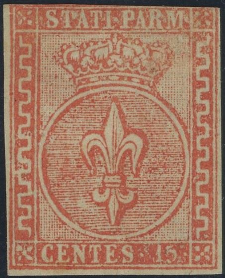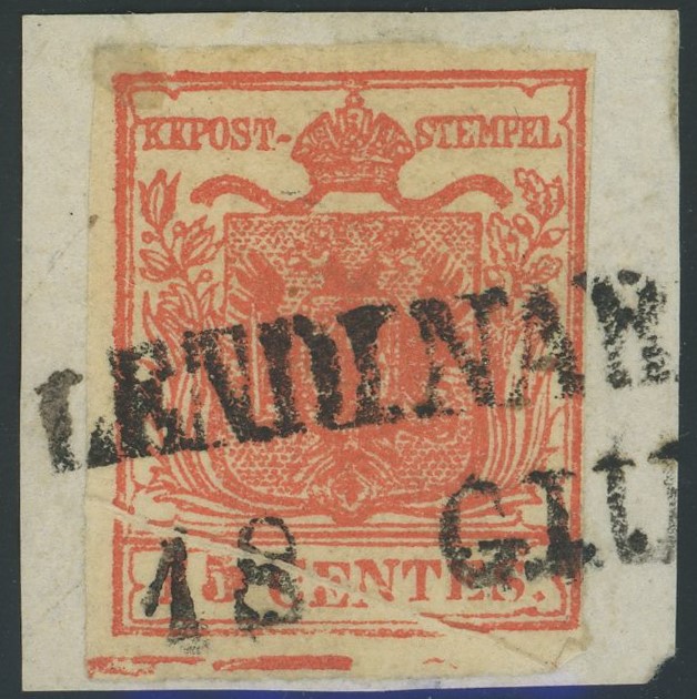 1850 - 15 cent. rosso vermiglio II tipo n.4 con spazio tipografico e pli d'accordéon, usato a Lendinara 18.06 a filo a destra ma margine completo. Raro insieme. (A)