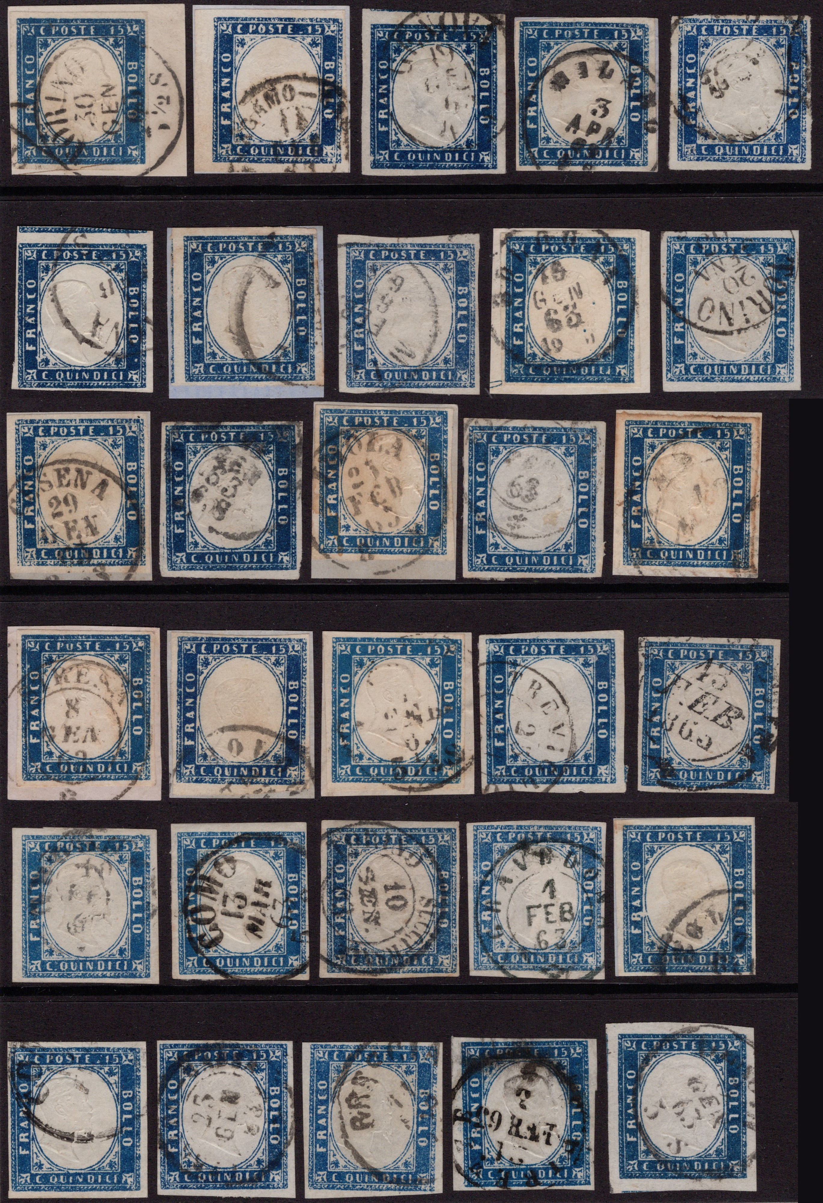 1863 - Interessante studio dei colori del 15 cent. tipo Sardegna n.11, insieme composto da 30 esemplari di ottima qualità media. Insieme molto interessante.