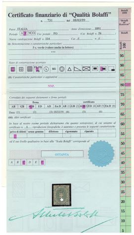 1891 - Stemma 5 cent. verde n.59 molto ben centrato, nuovo con gomma integra. Certificato Finanziario Bolaffi.