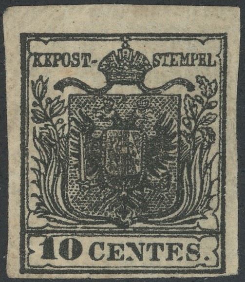 1850 - 10 cent. nero carbone n.2e con la scritta ''CENTES'' ritoccata n.2e(k). Ottima qualità. Cat.8.500(in proporzione). (A+)
