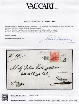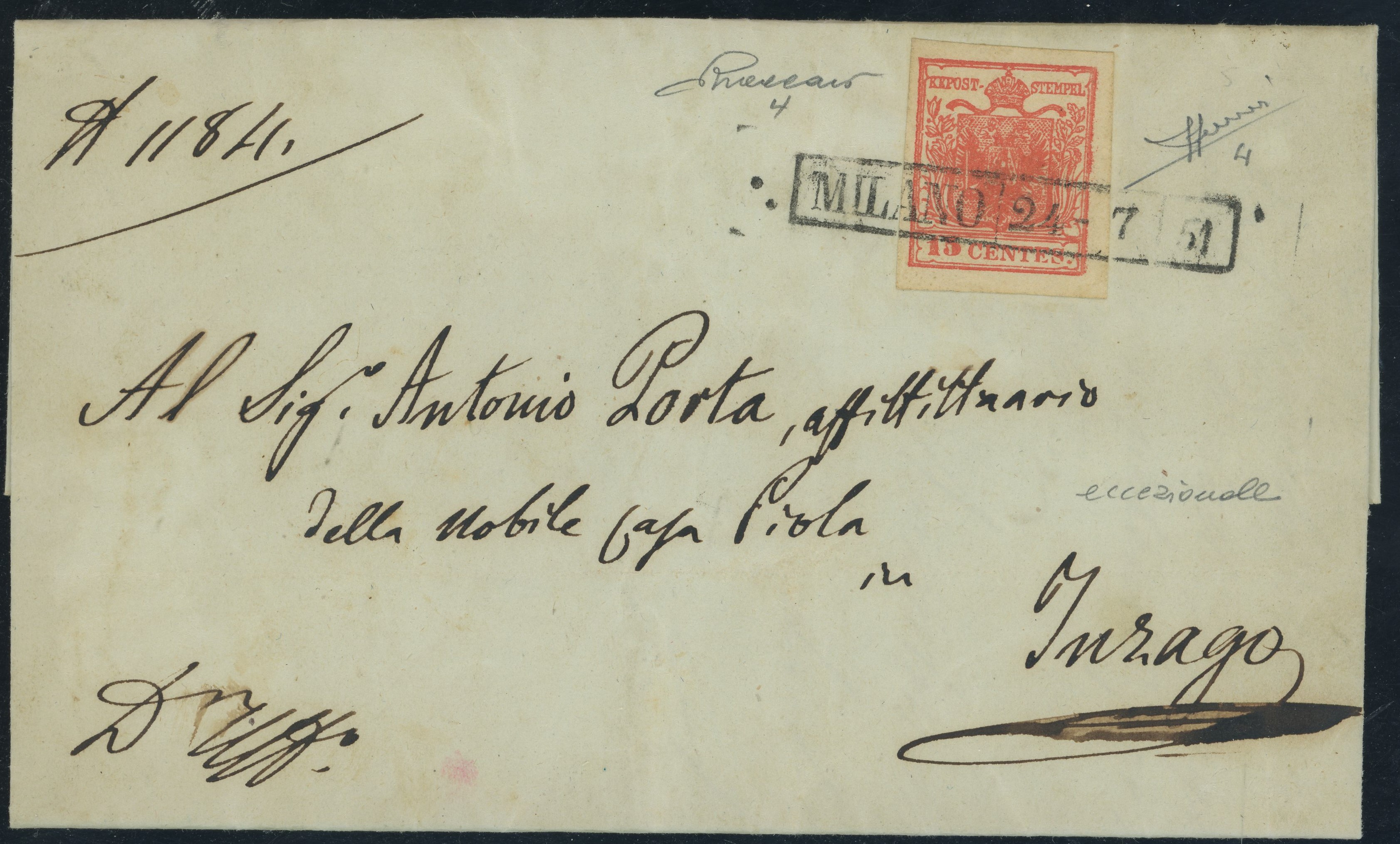 24.07.1851 - 15 cent. rosso vermiglio n.4 su lettera da Milano per Inzago. Qualità eccellente. (LUX) (Cert. Vaccari, Sorani)