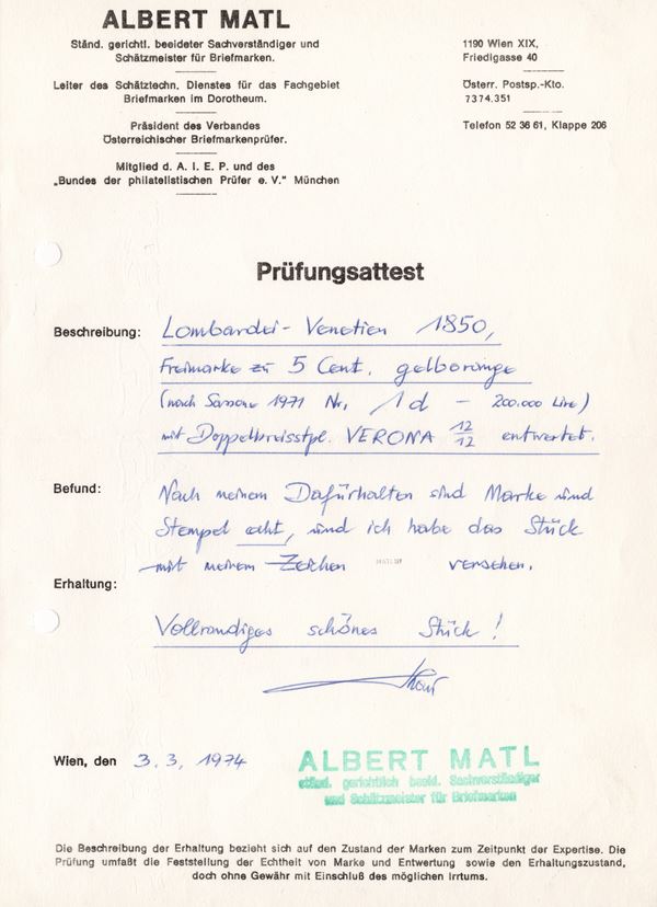 1850 - 5 cent. in tre diverse tonalità, notata una prima tiratura. Un certificato. (A+) (Cert. Matl)