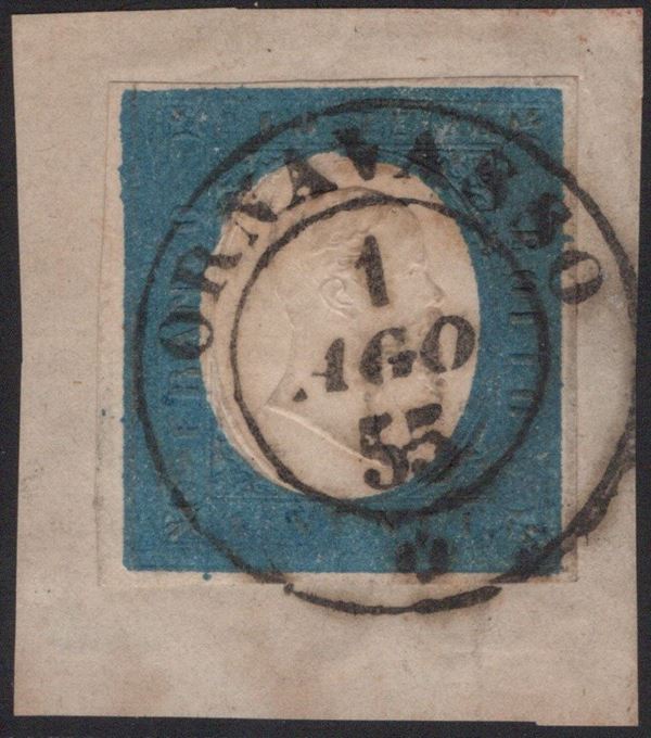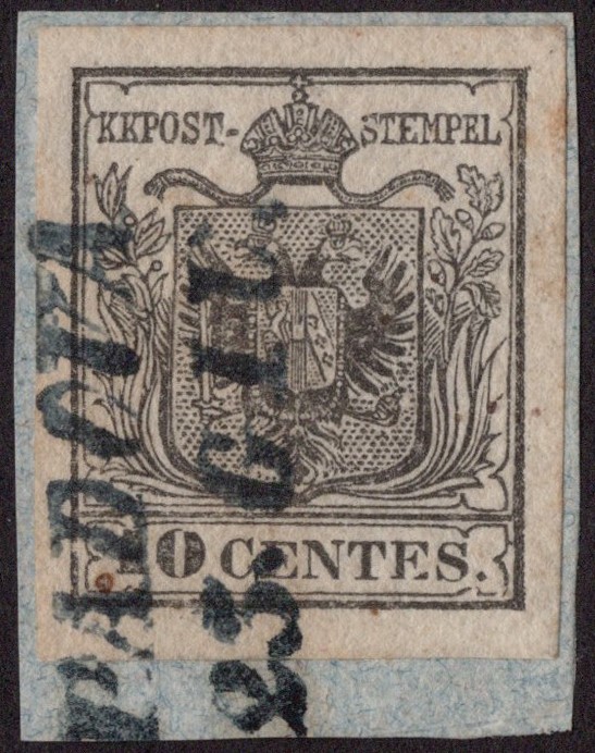 1850 - 10 cent. grigio nero n.2b annullato tramite lo SI di Padova in azzurro (pt.11) nel primo mese d'uso e conservato su frammento. (A)