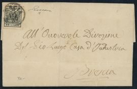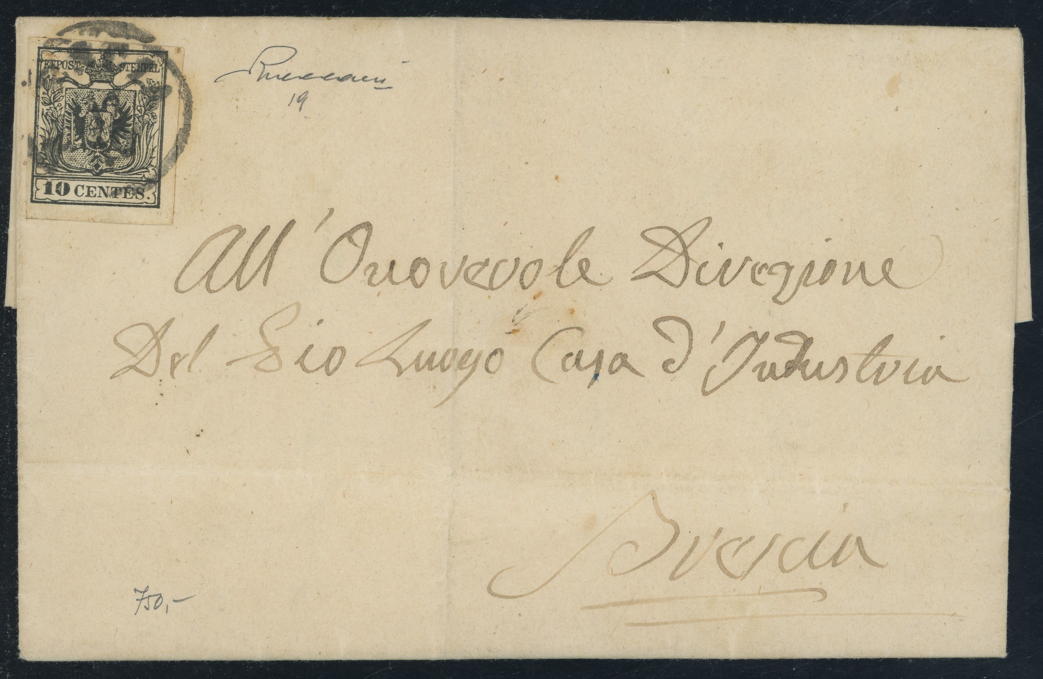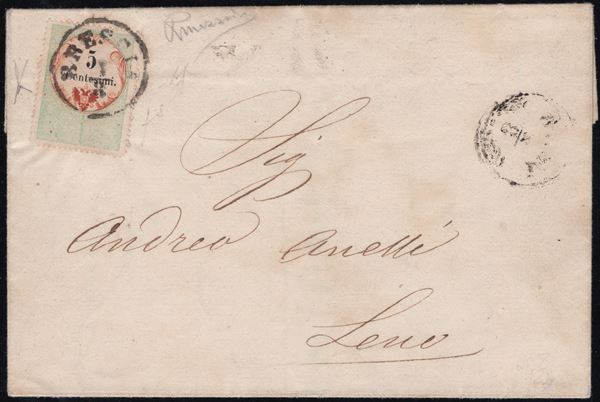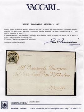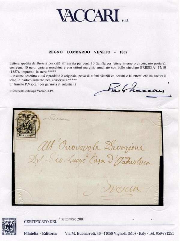 1858 - Lettera da Brescia per Città affrancata tramite un 10 cent. nero (tinta molto intensa) carta a macchina n.19. Insieme molto ben conservato e di ottima qualità. (A+) (Cert. Vaccari)