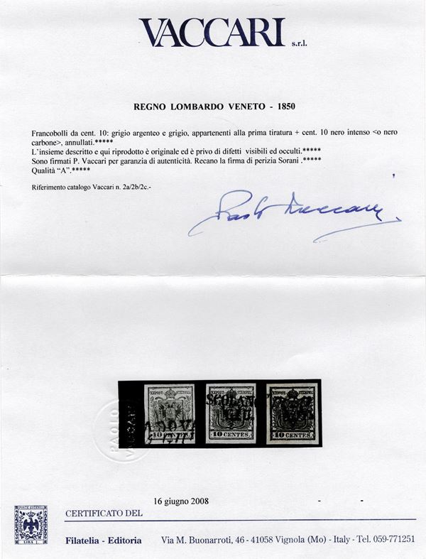 1850 - 10 cent. Grigio Argenteo n.2a (Vaccari e Sorani), Grigio nero n.2b (Emilio Diena, Sorani, Vaccari) e Nero Intenso n.2d (Sorani, Vaccari) tutti certificati Vaccari. Splendido Insieme di grande qualità. Cat. 3.500. (A+/LUX) (Cert. Vaccari)
