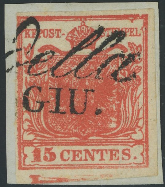 1850 - 15 cent. in una tonalità molto interessante con spazio tipografico in basso, usato a Cittadella e conservato su piccolo frammento. (A)
