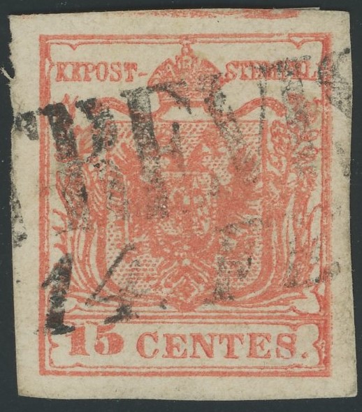 Lombardo Veneto - I emissione, 15 cent. III tipo con spazio tipografico.