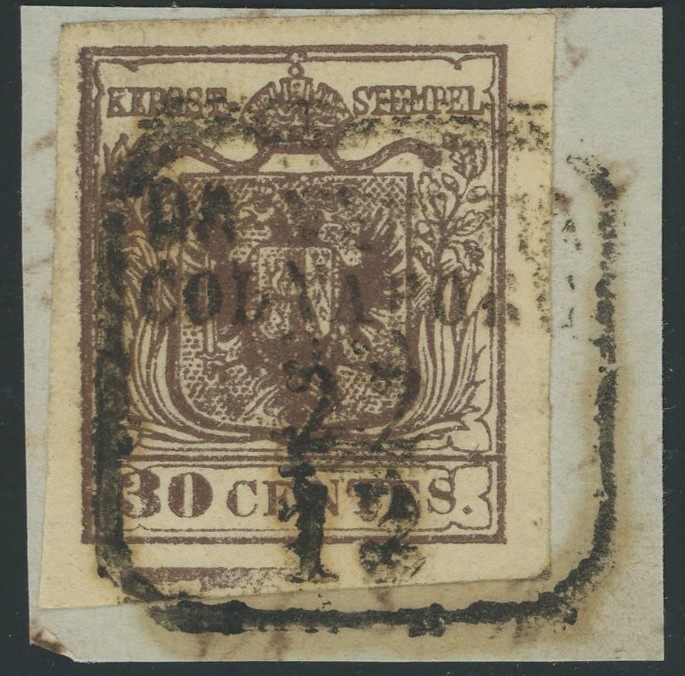 Lombardo Veneto - I emissione, 30 cent. I tipo bruno scuro con spazio tipografico in basso.
