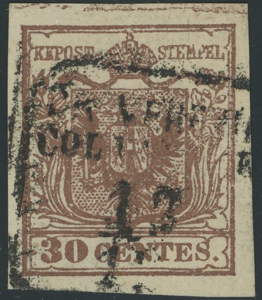Lombardo Veneto - I emissione, 30 cent. I tipo con carta Batonè e spazio tipografico