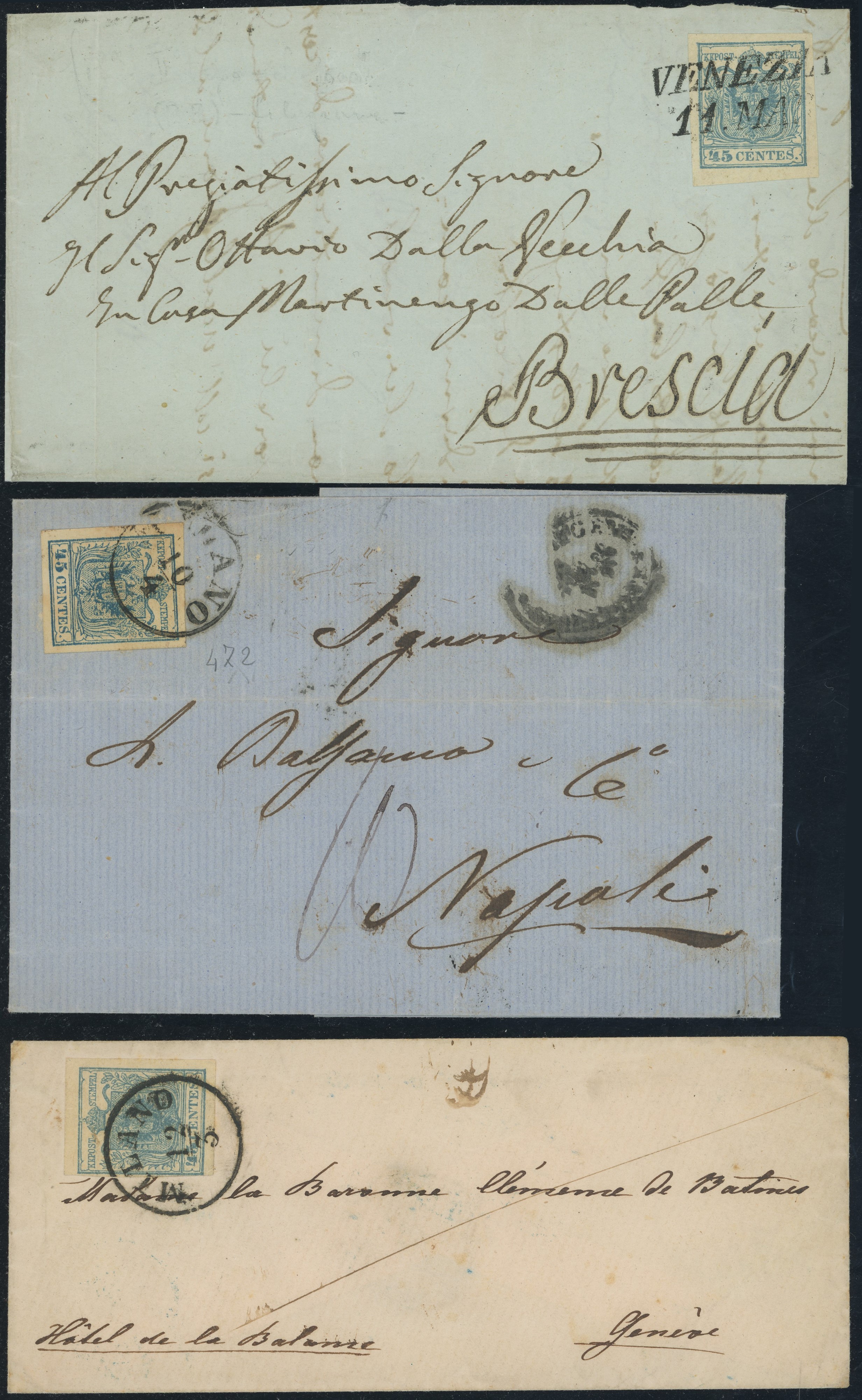 Lombardo Veneto - I emissione, tre interessanti lettere affrancate con il 45 cent.