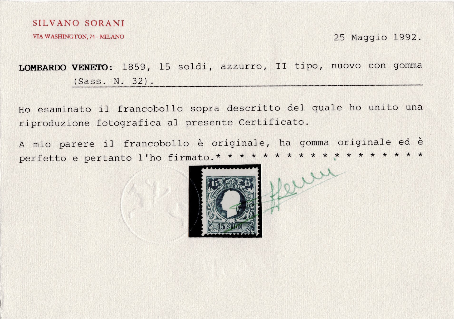 1859 - 15 soldi azzurro nuovo con gomma originale, fresco e molto ben conservato. Cat. 16.000. (A+) (Cert. Sorani)