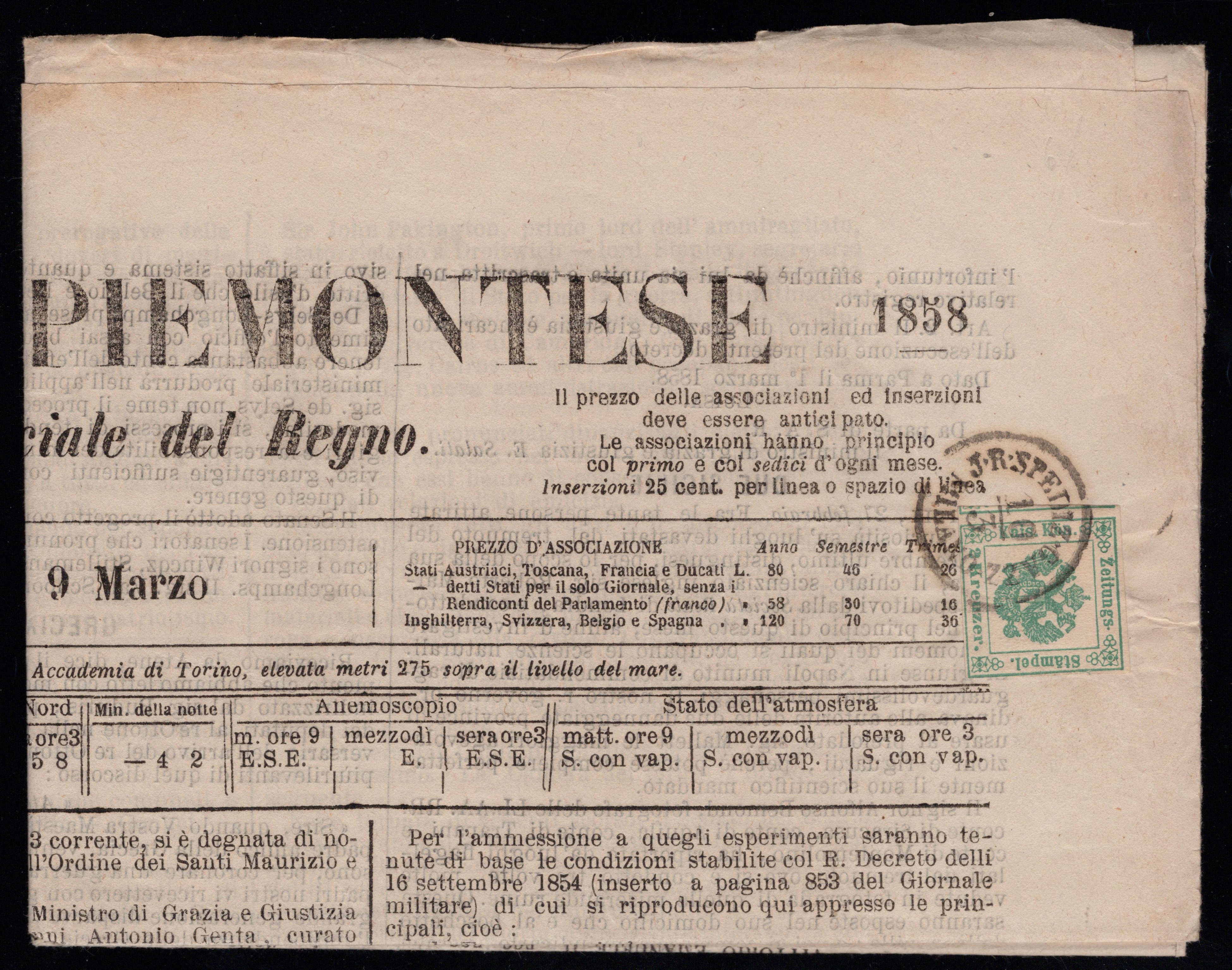 1853 - 2kr. verde usato sulla ''Gazzetta Piemontese'' del 1858, sul segnatasse l'annullo ''Spediz. Milano Gazz.'' (A+)