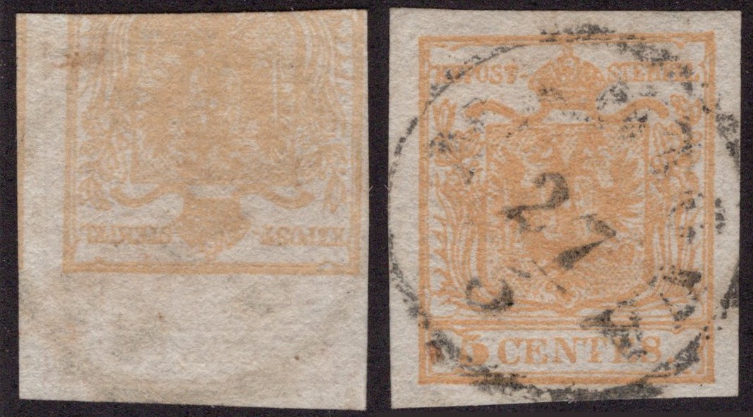 1850 - 5 cent. stampa recto capovolta, interessante l'impressione di una sola metร del francobollo (probabilmente in corrispondenza del bordo di foglio). (A+)