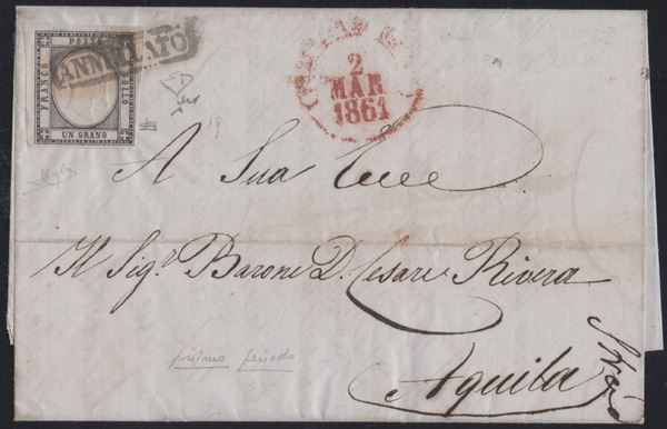 1857 - Raccomandata da Rovigo 02.09.1857 per Roma affrancata tramite un 45 cent. azzurro carta a macchina n.22 con principio di croce di S.Andrea a sinistra e bordo di foglio in basso mentre al retro, per il diritto di raccomandazione e usato come chiudilettera, un 30 cent. bruno carta a macchina n.21 anch'esso bordo di foglio in basso. Sul recto della lettera la tripla impronta del ''Raccomandata'' in cartella. Raro insieme.