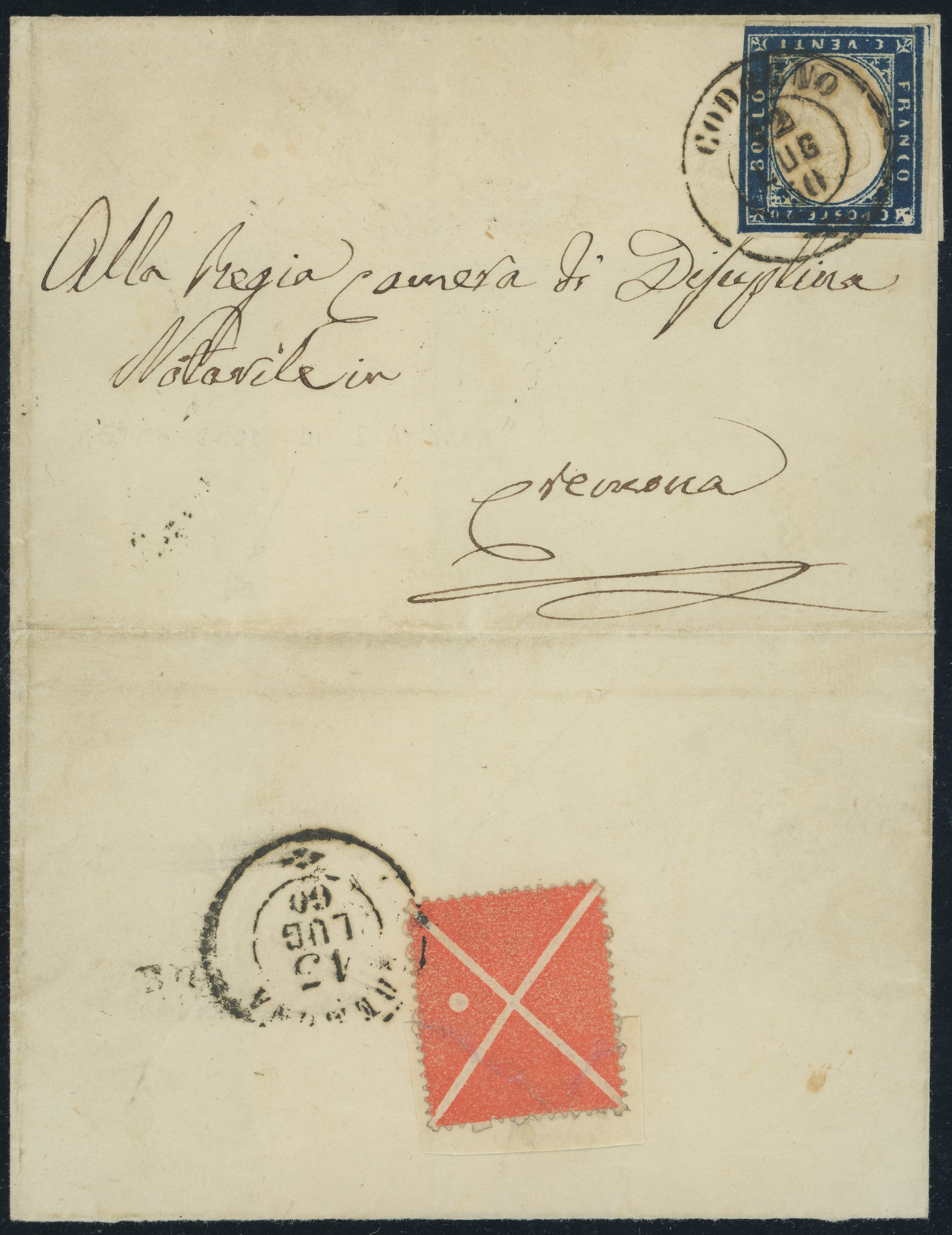 12.07.1860 - Lettera da Codogno per Cremona affrancata tramite un 20 cent. della IV em. di Sardegna cobalto oltremare n.15Ba. Al retro una Croce di S.Andrea ''formato grande'' con indicazione della tavola, anchessa annullata tramite il doppio cerchio di Codogno. Insieme assolutamente non comune. (A-)