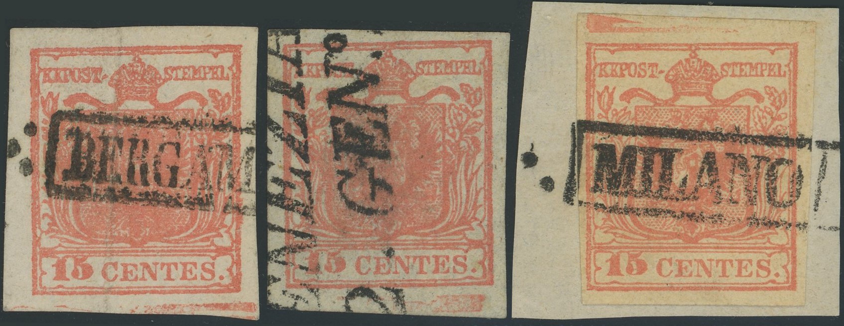 Lombardo Veneto, 15 cent. II tipo n.5, tre esemplari con spazio tipografico.