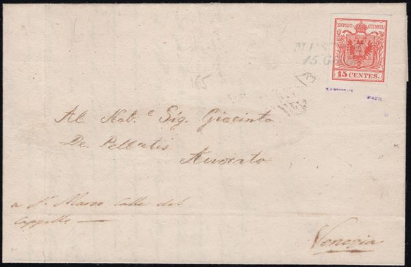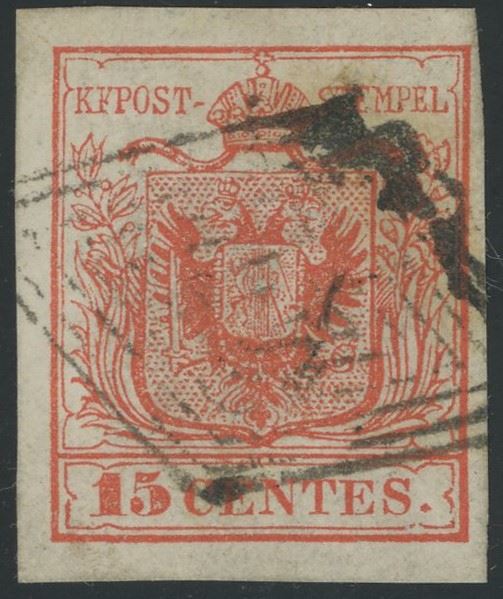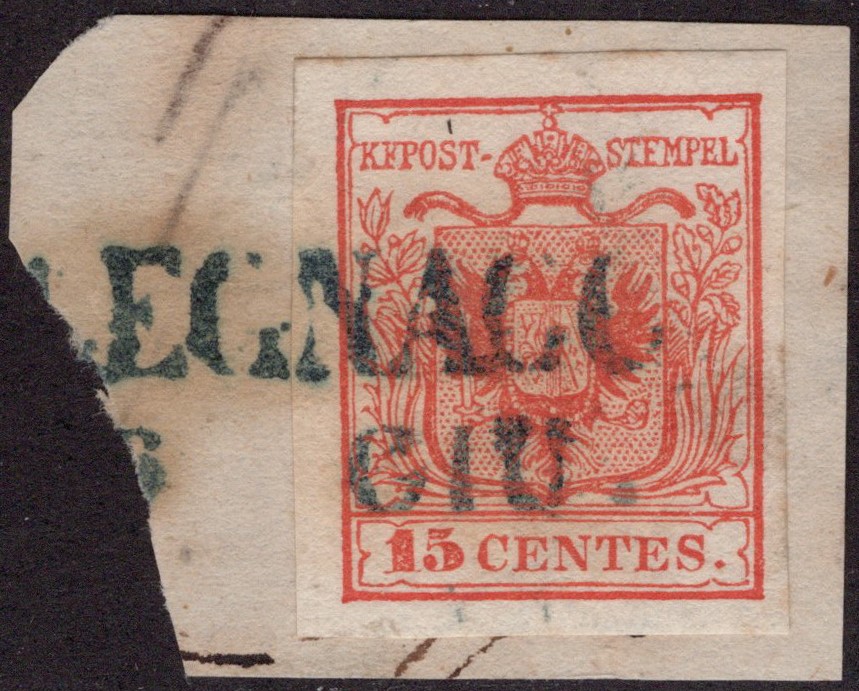 1850 - 15 cent. rosso I tiratura n.3a annullato tramite lo Stampatello Diritto di Legnago in azzurro (12pt.) nei primi giorni d'uso e conservato su frammento. Splendido insieme. (A+)
