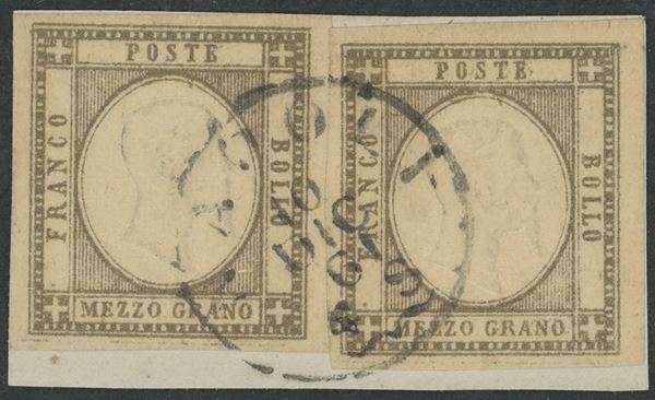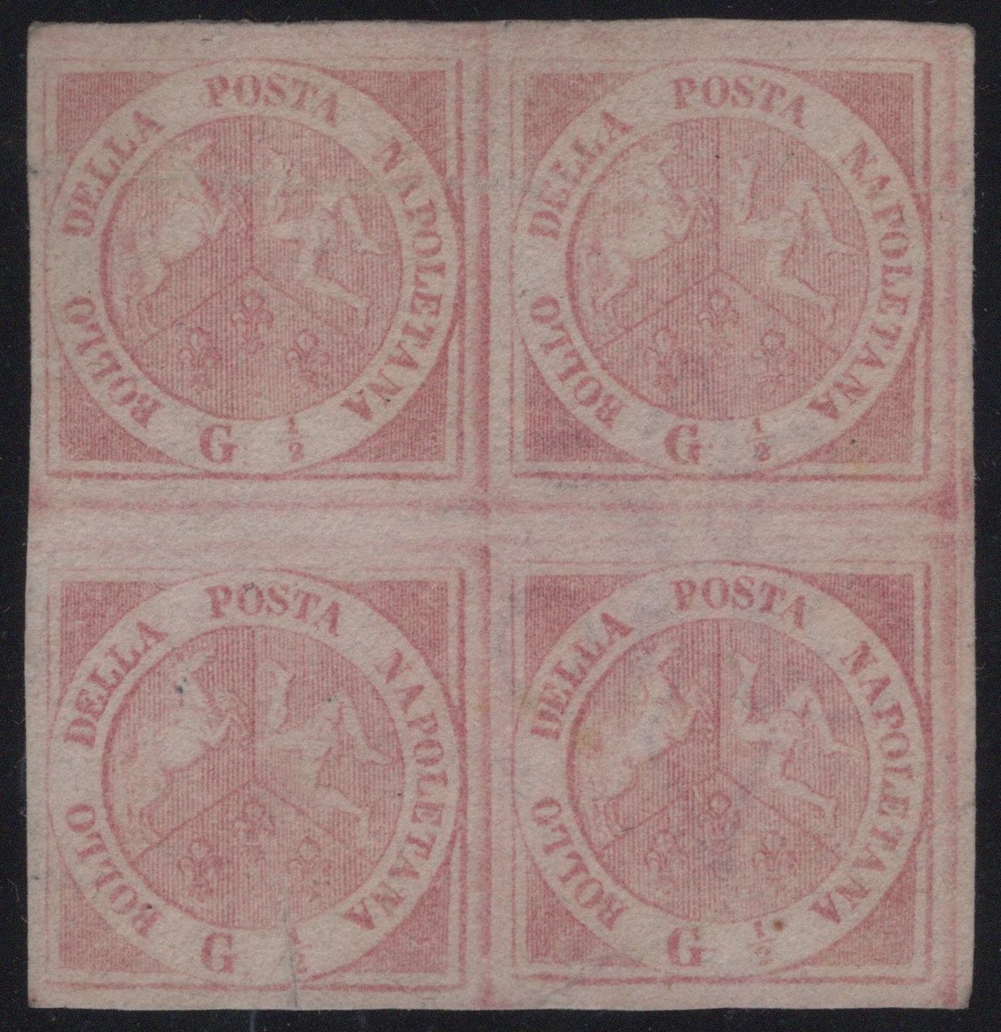 1858 - 1/2 grano rosa n.2c/2f in quartina nuova. senza gomma. I due esemplari di sinistra sono senza filigrana, rarissimi allo stato di nuovo. Una leggera piega attraversa gli esemplari superiori. Cat. 17.500++. (A-)