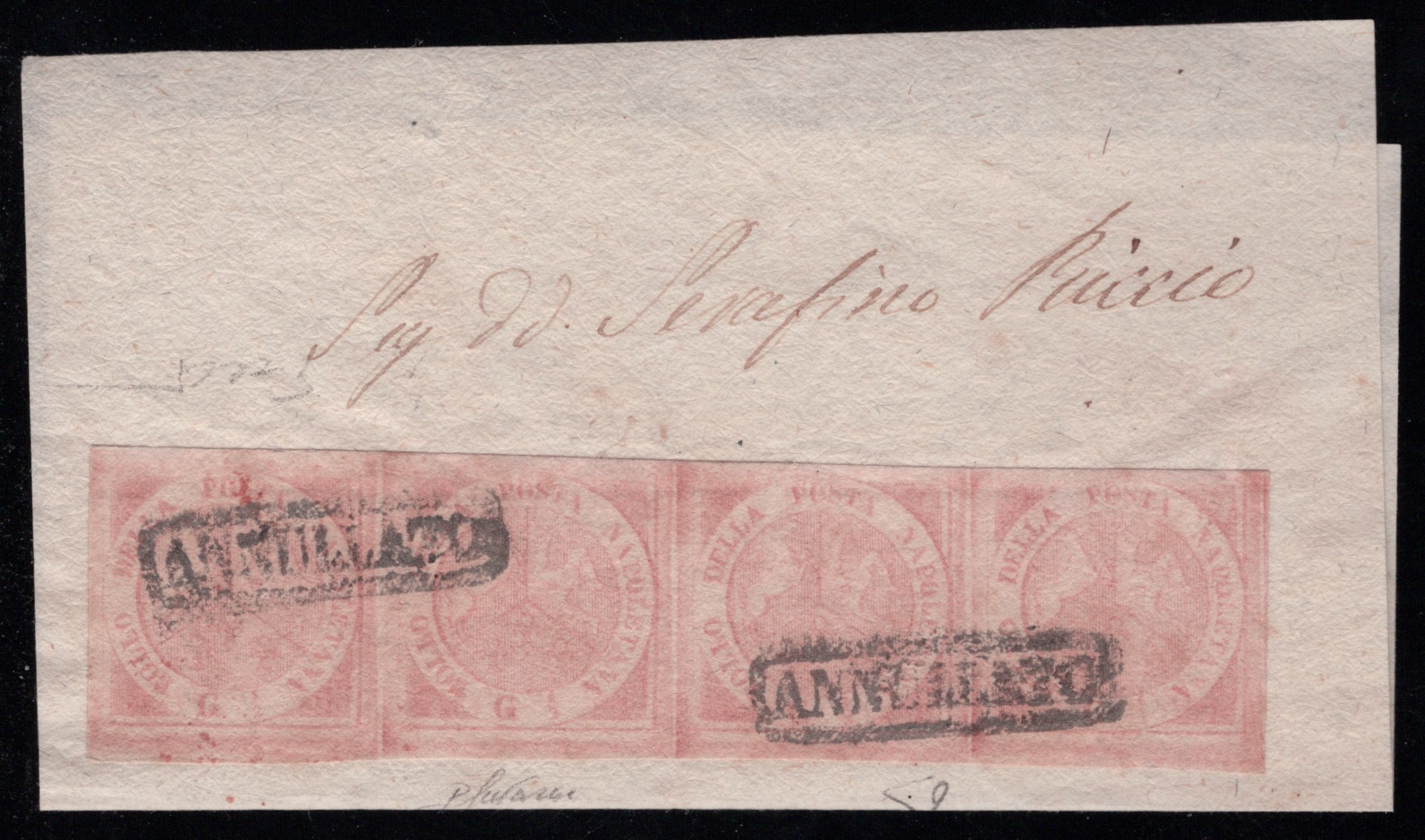 1858 - 1/2gr. rosa chiaro I tav. n.1 in striscia di 4 su frammento, molto ben marginata. (A) (Enzo Diena)