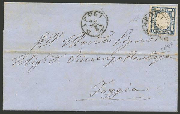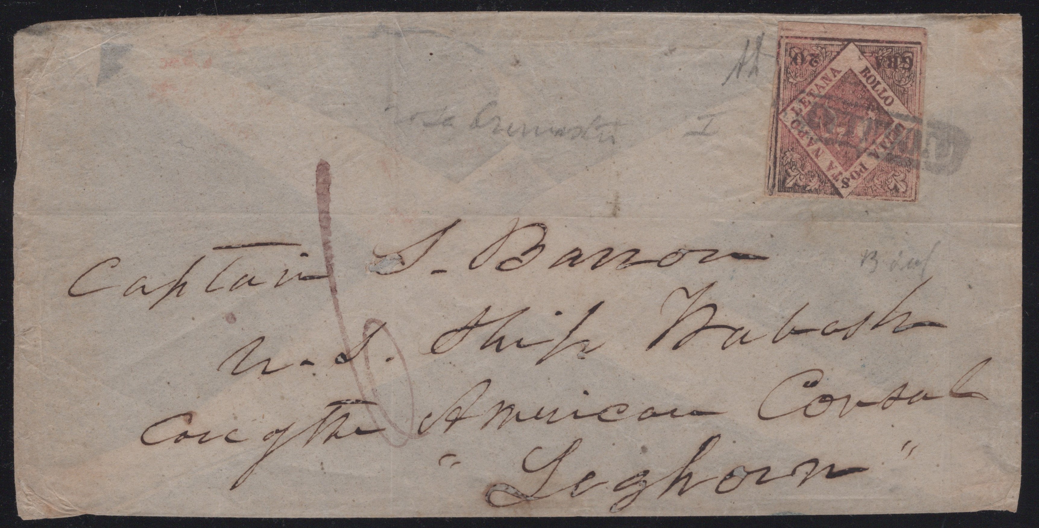 1859 - Lettera spedita da Napoli per Livorno (sulla soprascritta ''LEGHORN'', termine inglese per indicare la città di Livorno) affrancata tramite un 20gr. rosa lillaceo I tav. n.12a isolato, rasente in alto. Cat. 13.000. (B) (Alberto Diena)