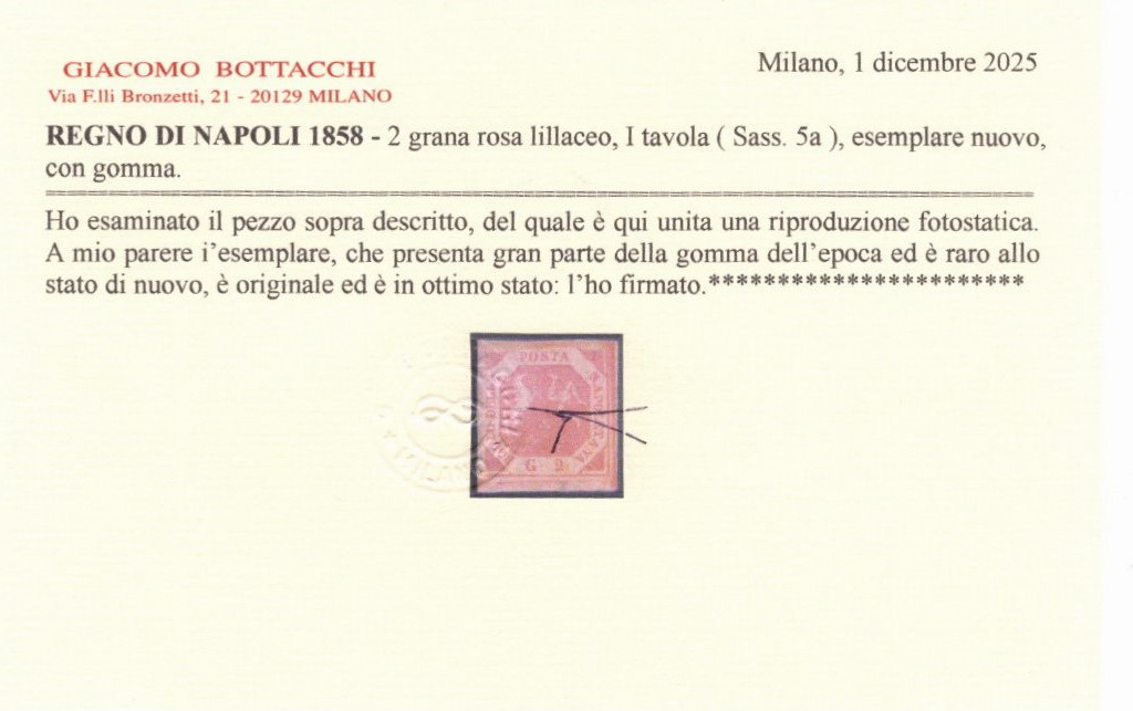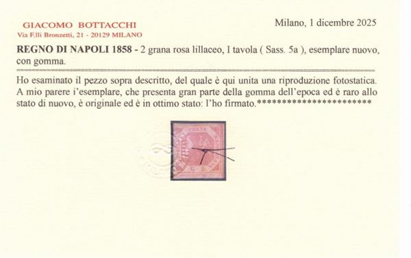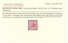 1858 - 2gr. I tav. rosa lillaceo n.5a in una tonalità con molto lilla. Tonalità di grande pregio allo stato di nuovo. Cat.26.000 euro. (A-) (Cert. Bottacchi)
