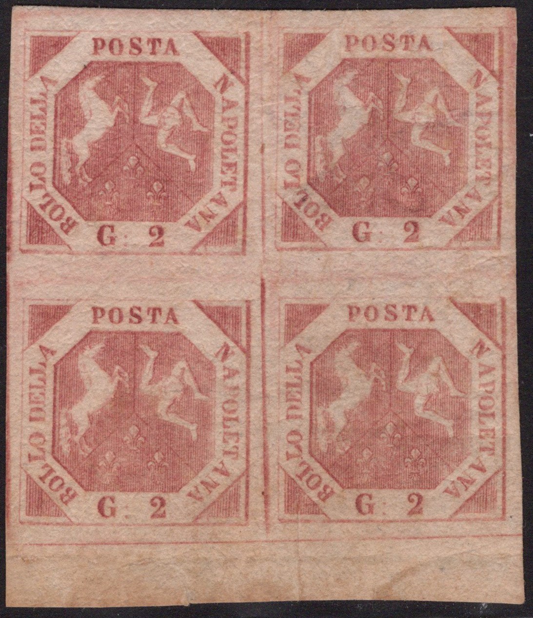 Napoli - 2gr. III tavola rosa brunastro in quartina nuova con gomma e filigrana ''Linee sinusoidi'' nel bordo di foglio in basso.