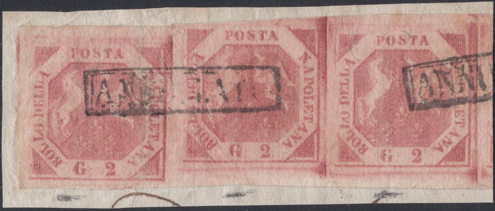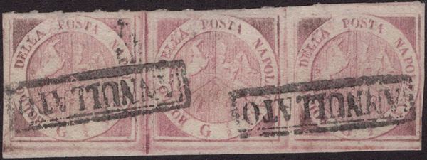 1858 - striscia di tre con forte disallineamento tra il primo ed il secondo esemplare. Splendido insieme conservato su frammento. (A+) (Alberto Diena)