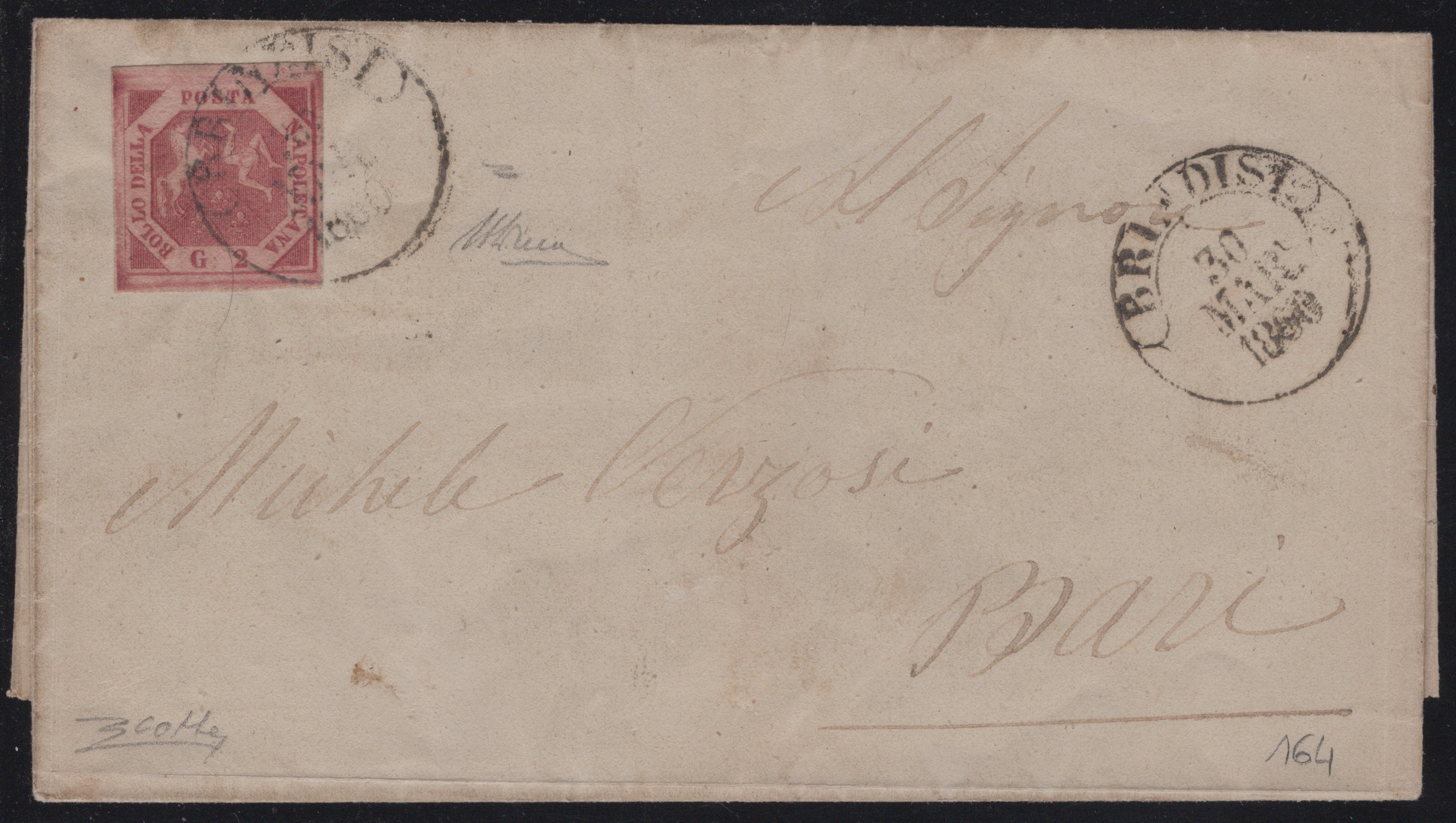 30.03.1860 - Lettera da Brindisi per Bari affrancata tramite un 2gr. carminio vivo n.5f, sull'affrancatura il cerchio di brindisi (12pt.). (A+) (Alberto Diena, B. Colla)