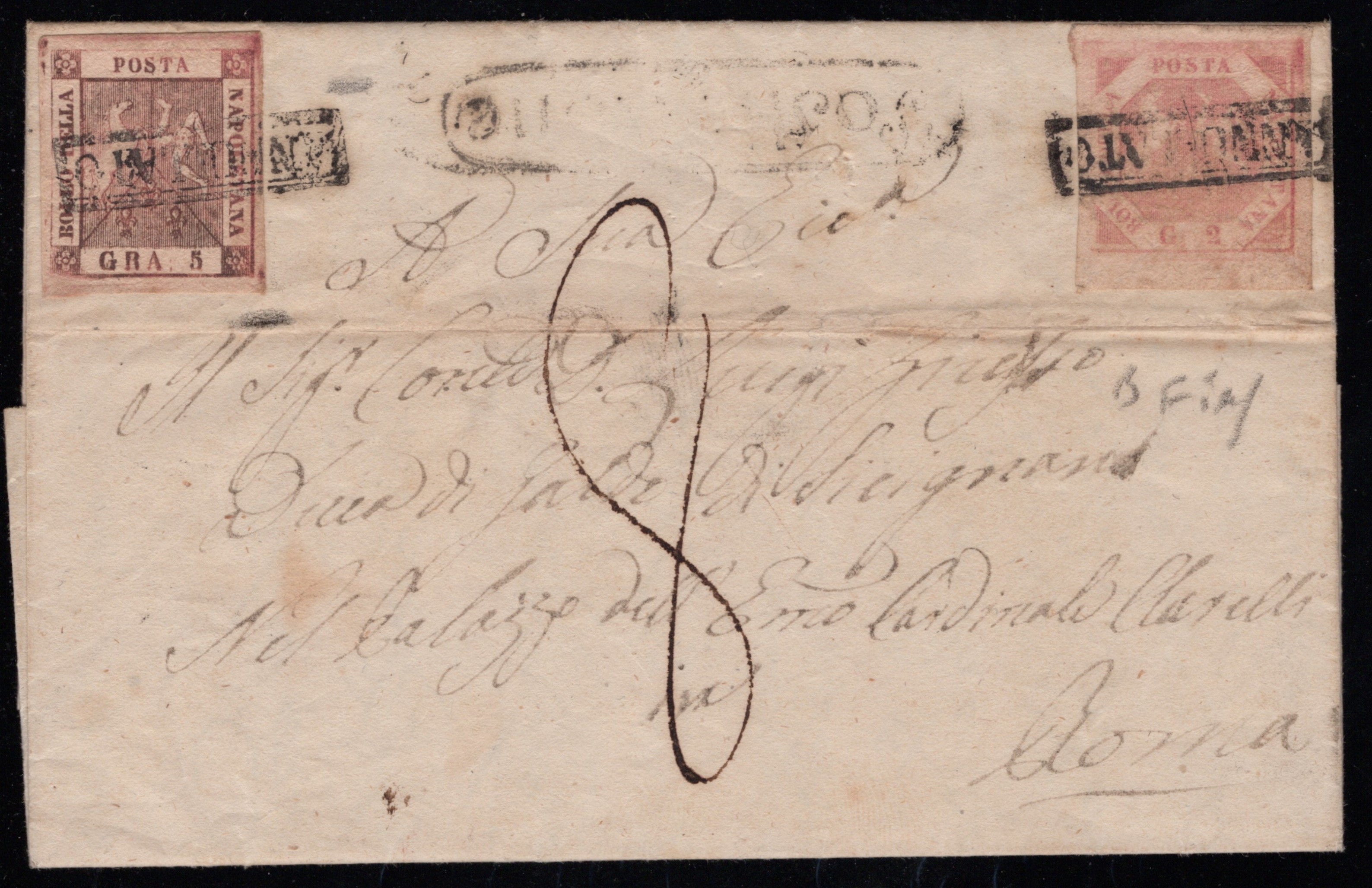 1858 - Lettera da Postiglione (pt.10) per Roma affrancata per 7gr. tramite un 5gr. I tav. rosa lillaceo n. 8a + 2gr. I tav. rosa n.5. Insieme non comune.
