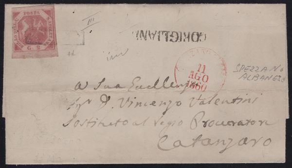06.04.1861 - Lettera da Salerno per Castrovillari affrancata tramite un 2gr. I tav. carminio n.5e. Sull'affrancatura l'annullo a cerchio di Salerno (9pt.) Piega d'archivio. (A-)