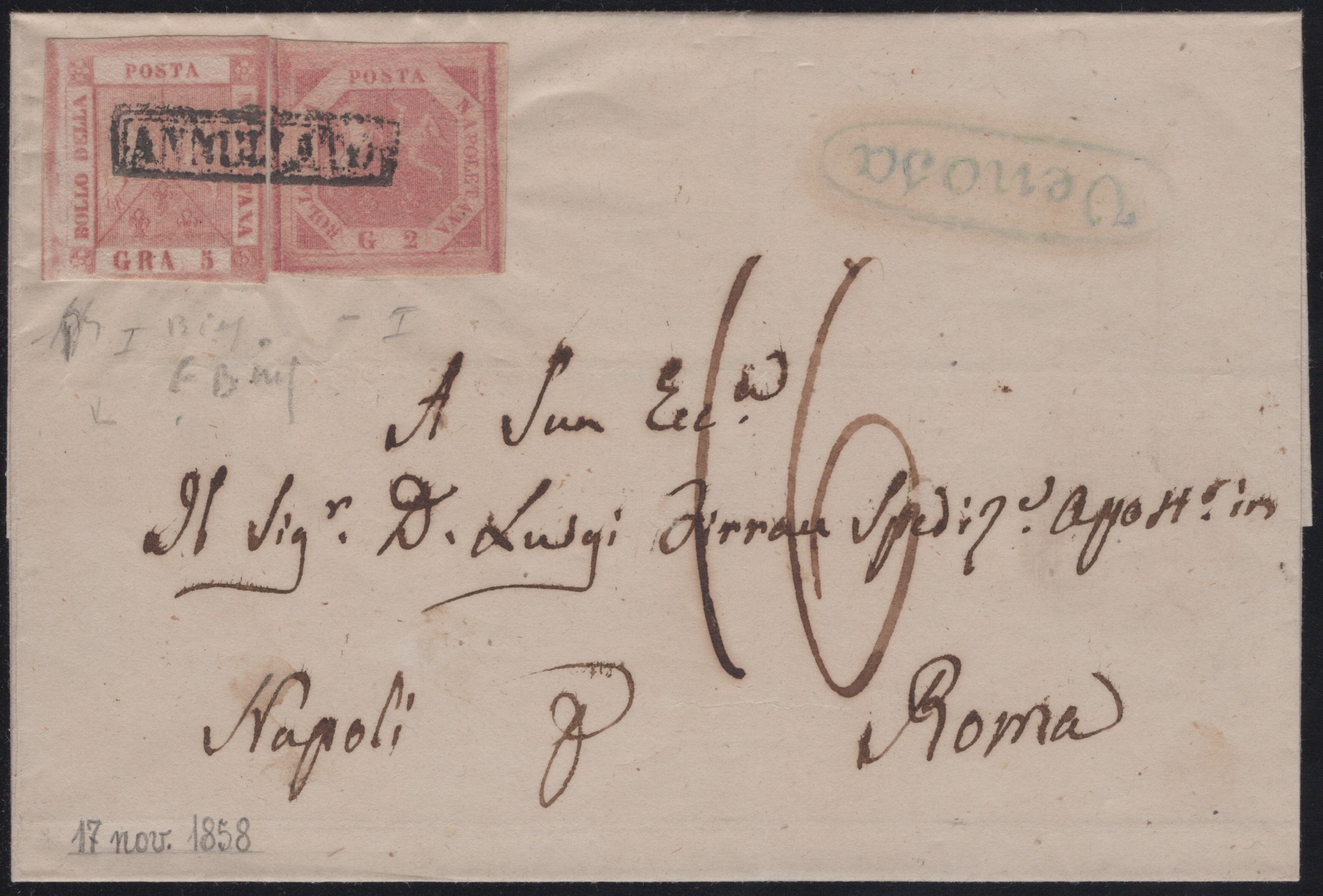 19.12.1859 - Lettera da Venosa per Roma (Via Napoli) affrancata per 7 grana tramite un 2gr. I tav. rosa chiaro n.5 + 5gr. I tav. rosa brunastro n.8. (A)