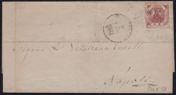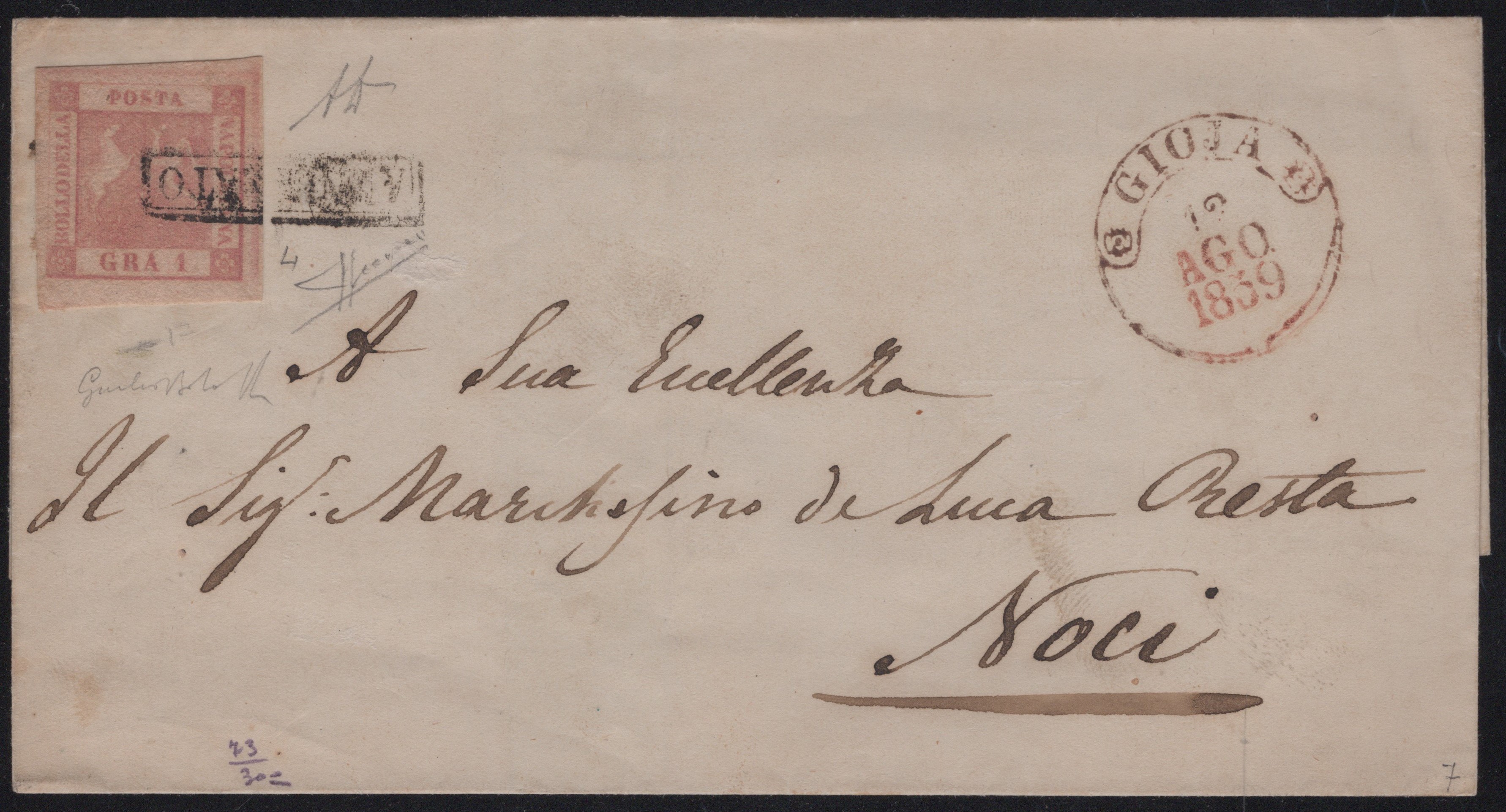 12.08.1859 - Lettera da Gioja per Noci affrancata tramite 1gr. rosa carminio n.4. Sull'affrancatura l'annullo in cartella ''Annullato'' accompagnato dal cerchio rosso sulla sovrascritta di Gioja (7pt.). Raro insieme. Alberto Diena, Bolaffi, Sorani)