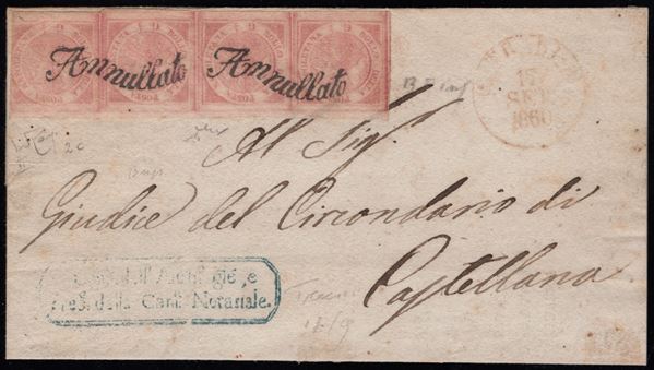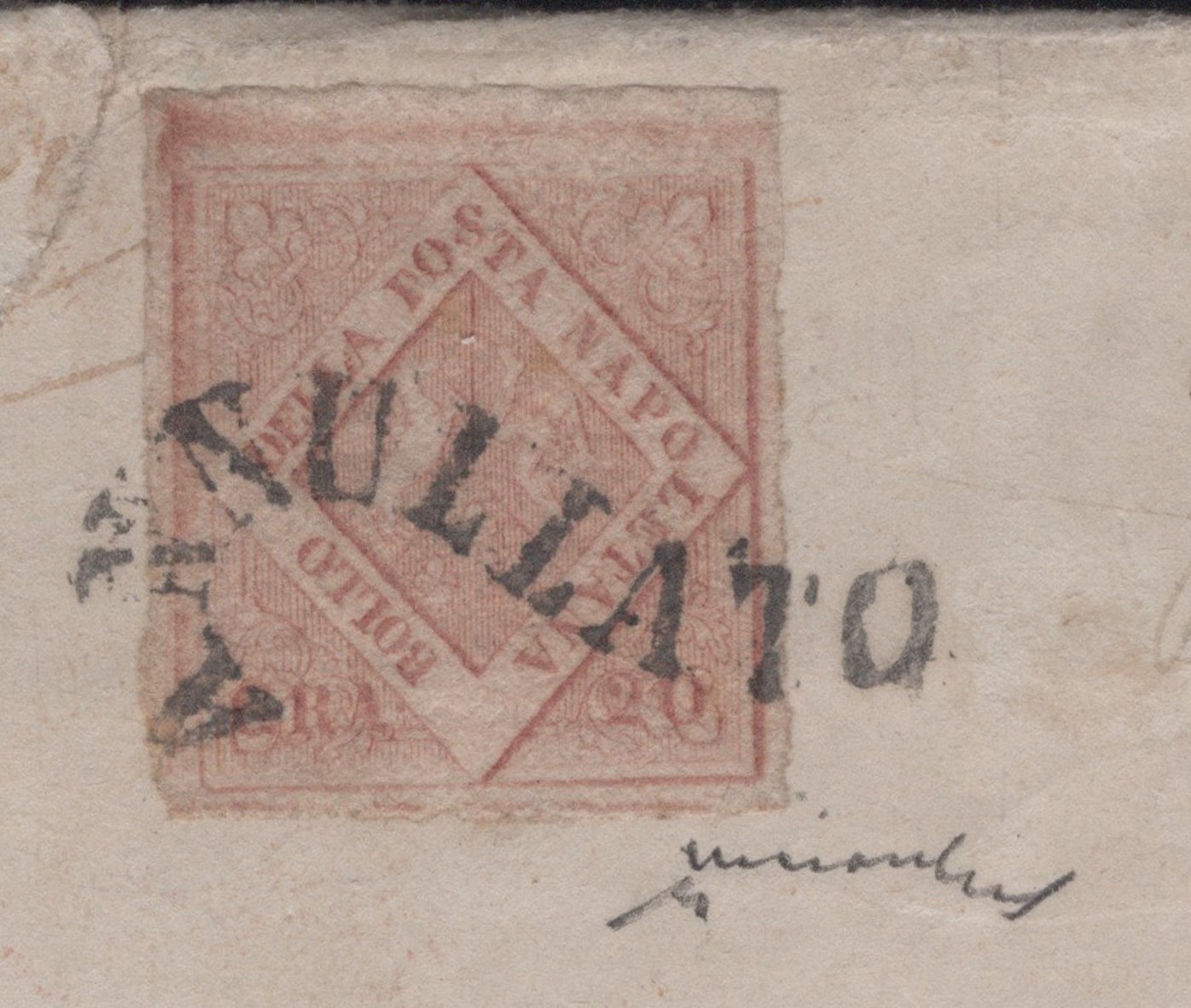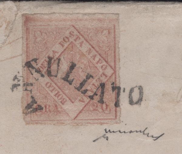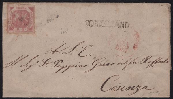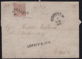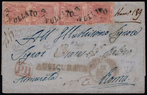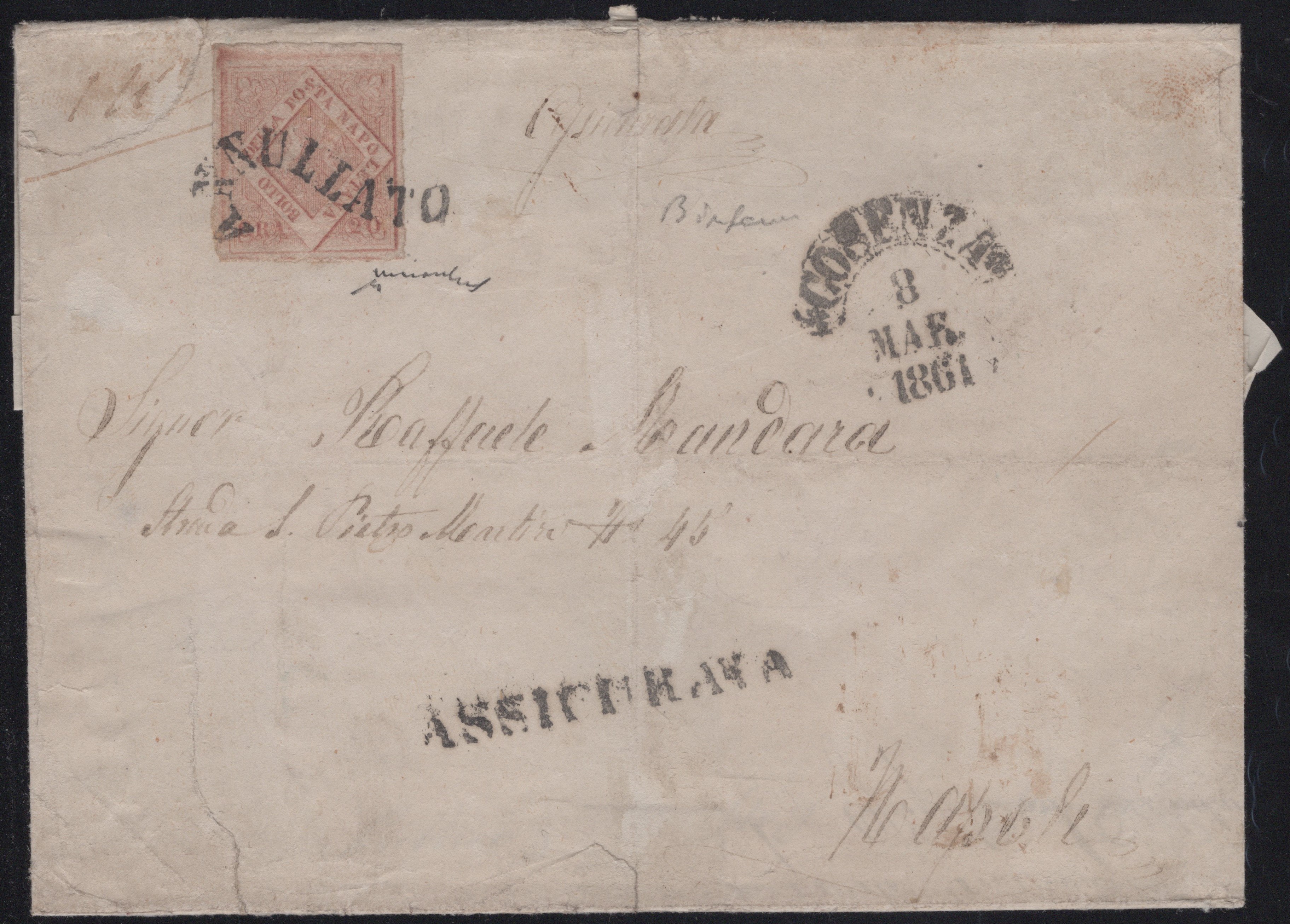 08.03.1861 - Assicurata da Cosenza per Napoli affrancata tramite un 20 grana II tav. rosa chiaro n.13, isolato ed annullato tramite lo svolazzo tipo 5 di Cosenza (6pt.). Insieme di grande pregio, data la sua rarità venne firmato per esteso da Chiavarello. (A+) (Chiavarello per esteso)
