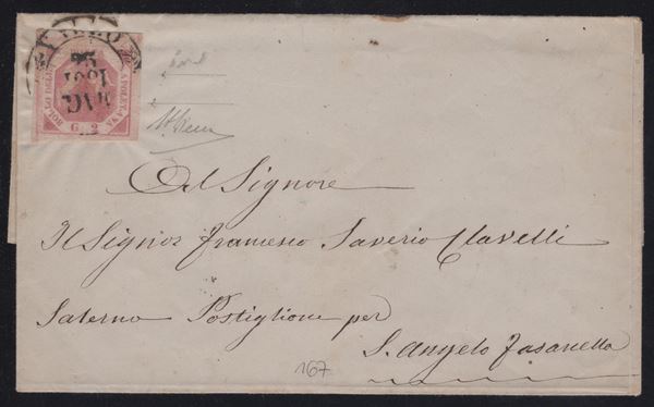25.08.1859 - Lettera da Napoli per Genova viaggiata tramite i Piroscafi francesi affrancata per 16gr. tramite 1 gr. rosa lillaceo I tav. n.3a + 5gr. rosa chiaro I tav n.8c + 10gr. rosa carminio chiaro II tav. n.11a. (A-)