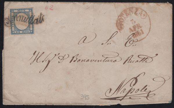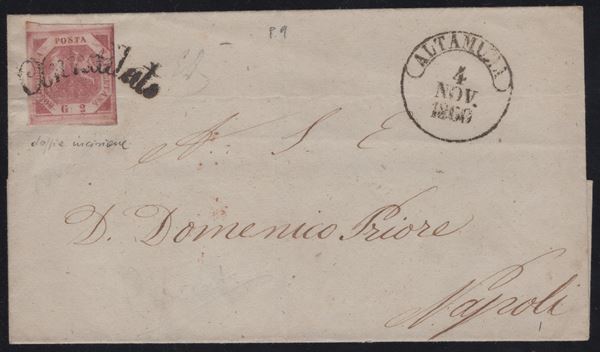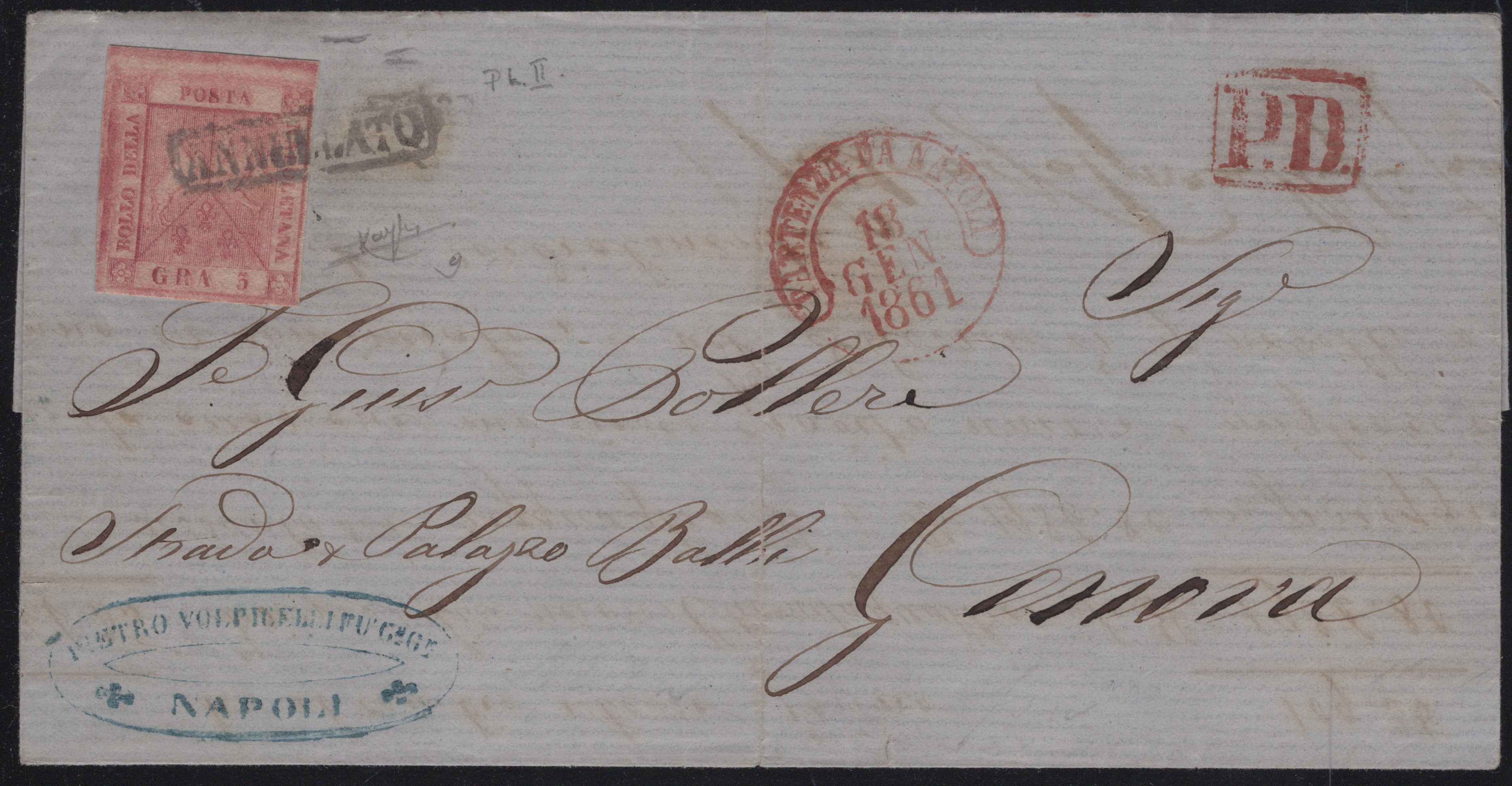 18.01.1861 - Lettera da Napoli per Genova affrancata tramite un 5gr. II tav. carminio rosa n.9. Questa lettera risulta particolarmente interessante perchè venne applicata la tariffa ''Nazionale'' da 20 centesimi (5gr. = 20 cent. c.a.). Questo tipo di tariffa, realizzata tramite un francobollo del regno di Napoli, durò pochi mesi 10.1860/14.02.1861, prima tutte le lettere per il regno di Sardegna erano affrancate per 16 grana e tassate in arrivo. (A) (Raybaudi)