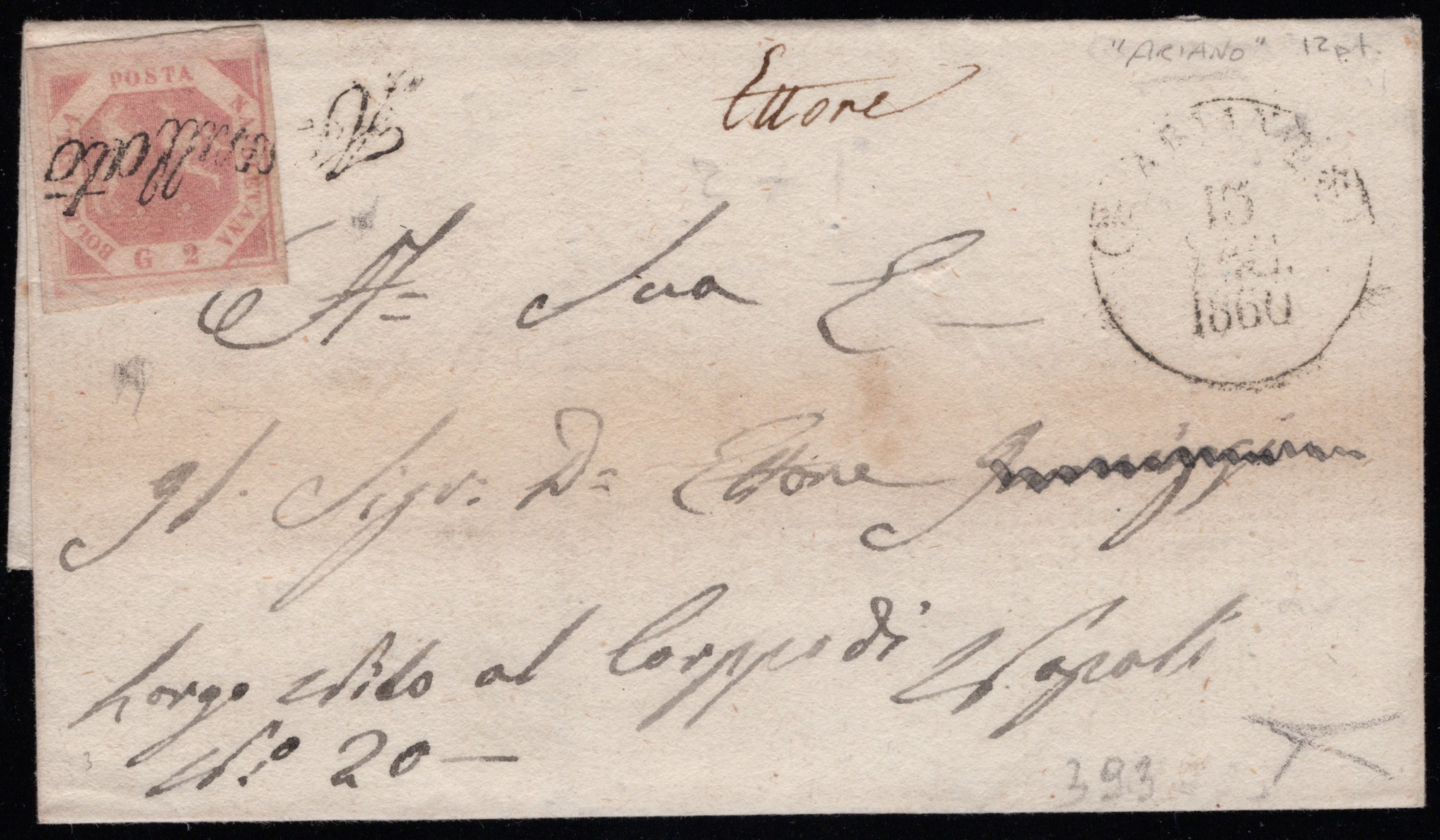 1860 - Busta spedita da Ariano per Napoli affrancata tramite un 2gr. I tav. n.5. Sull'affrancatura lo svolazzo tipo 29 di ARIANO (pt.12). Raro insieme. Cat,. 6.000++. (A) (Bottacchi)