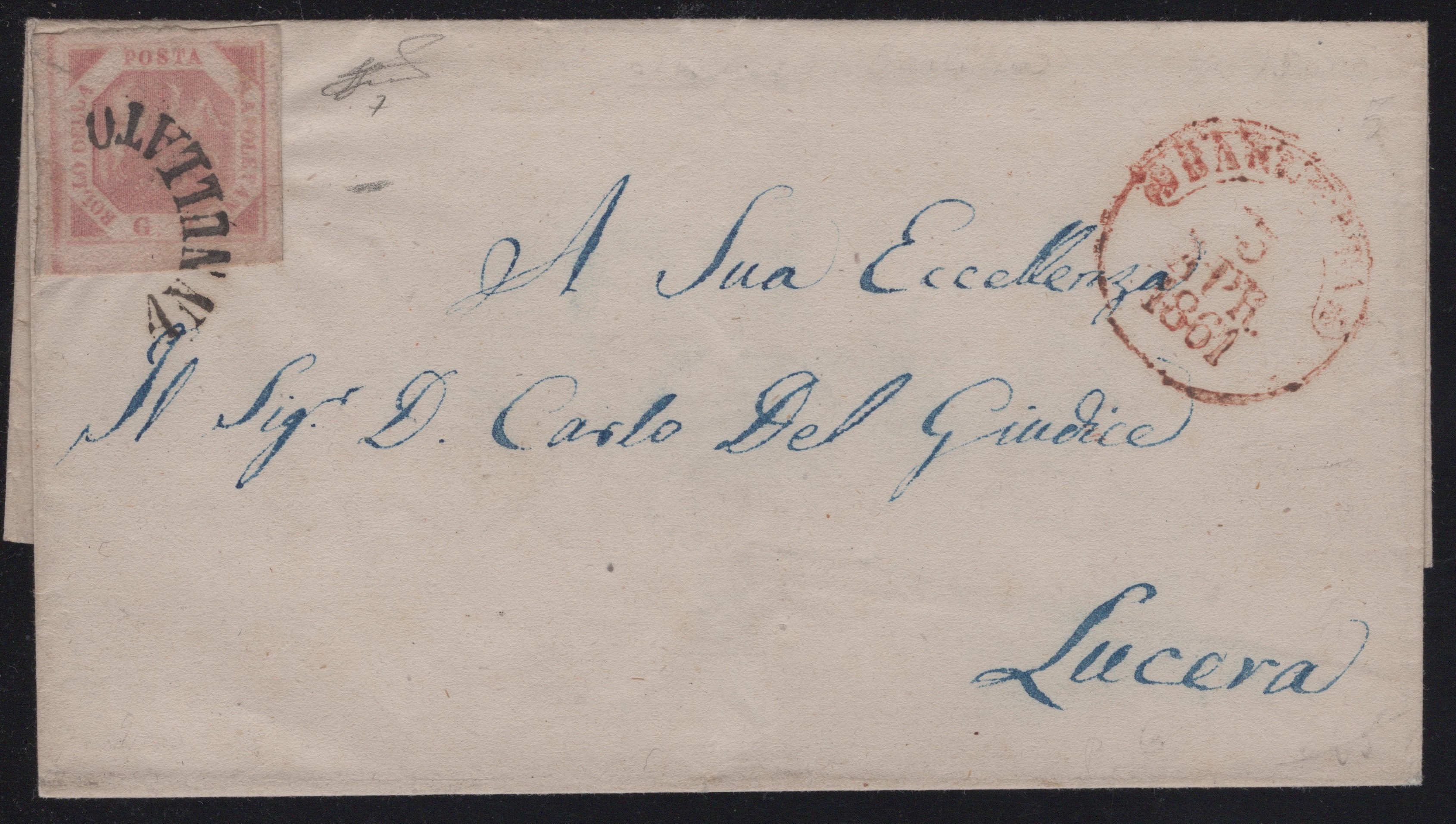 03.03.1861 - Lettera da Barletta per Lucera affrancata tramite un 2gr. III tav rosa chiaro n.7b. Sull'affrancatura lo svolazzo tipo 2 di Barletta (6pt.) (A+) (Ferrario)