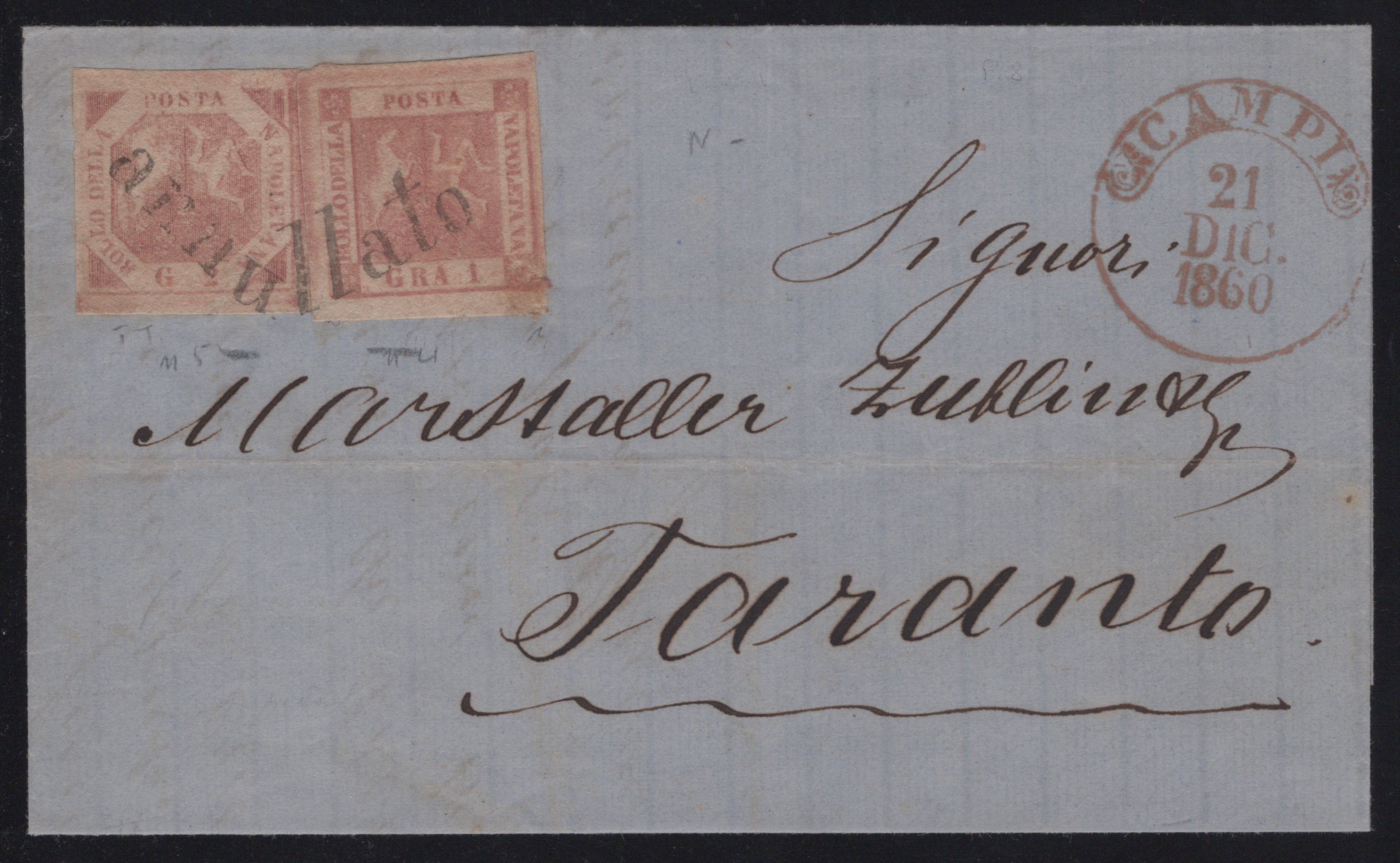 21.12.1860 - Lettera da Campi per Taranto affrancata per 3 grana tramite 1gr. II tav. rosa carminio n.4 + 2gr. I tav. rosa n.5, sull'affrancatura lo svolazzo tipo 8 di Campi (12pt.) (A-)