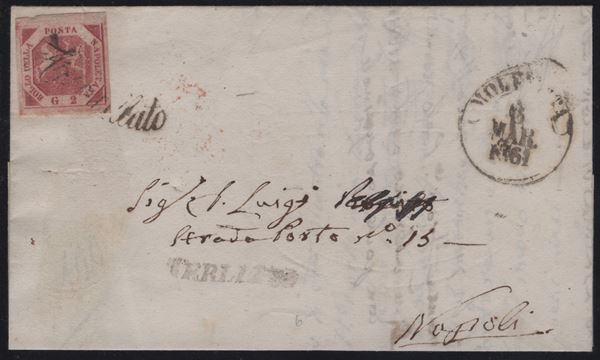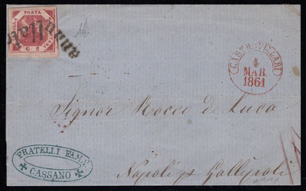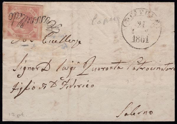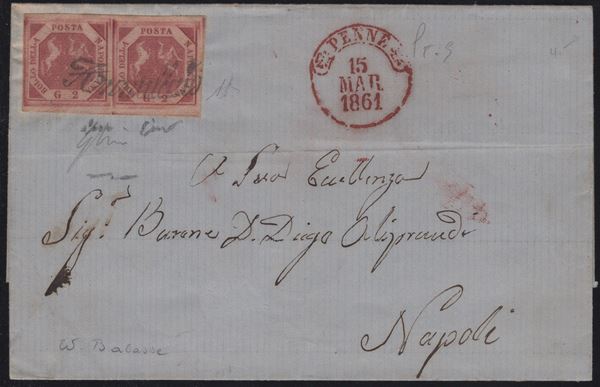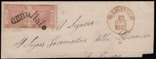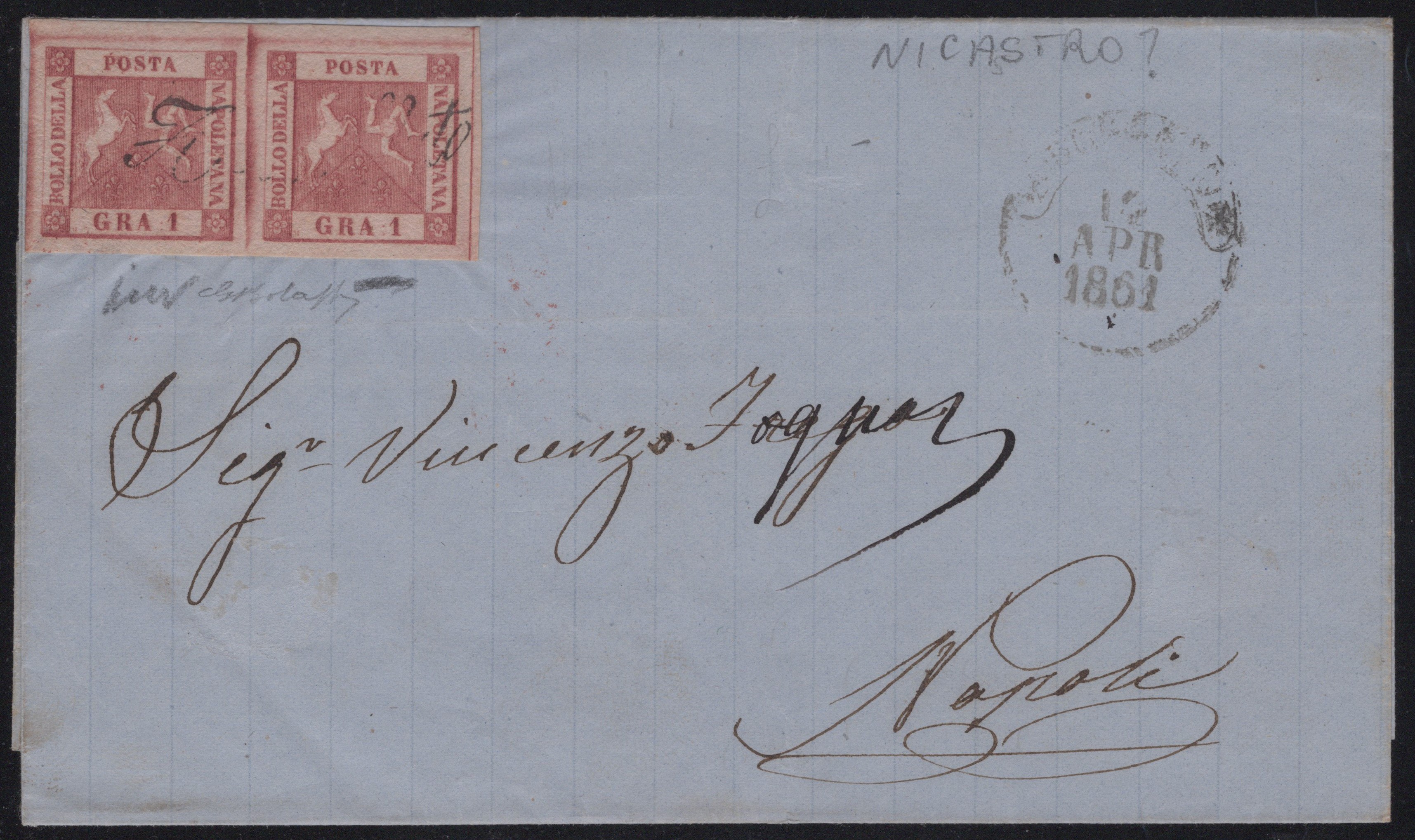 12.04.1861 - Lettera affrancata per 2gr. tramite una coppia dell' 1gr. carminio n.3a, sull'affrancatura lo svolazzo tipo 19 di Nicastro (9pt.). (LUX) (Bolaffi)
