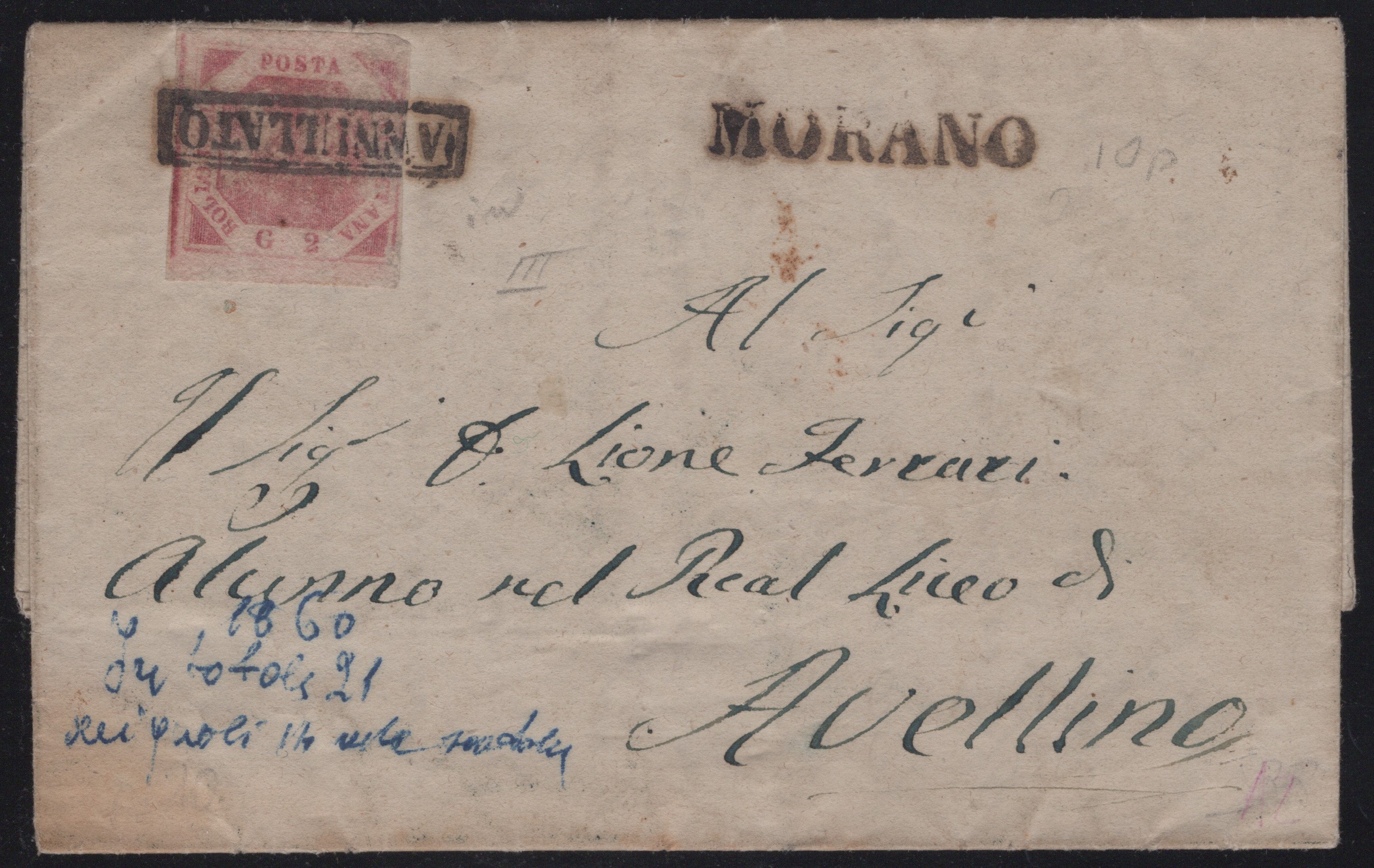 25.04.1860 - Lettera da Morano per Avellino affrancata tramite un 2gr. III tipo rosa carminio n.7c, sull'affrancatura l'annullo in cartella ''Annullato'' e lo SD di Morano (10pt.) (A-)