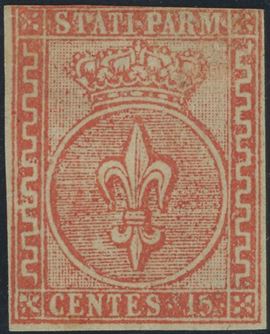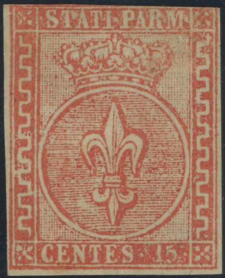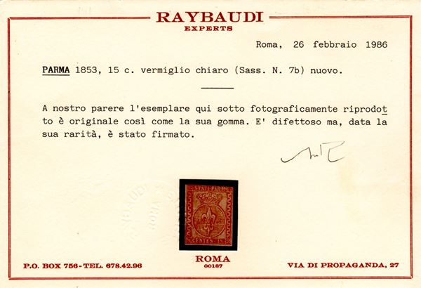 1853 - 15 cent. rosso vermiglio n.7a, nuovo con gomma originale. Tre ottimi margini ma stretto in alto, fresco e ben conservato. Cat. 40.000. (B) (Cert. Raybaudi, Alberto Diena)