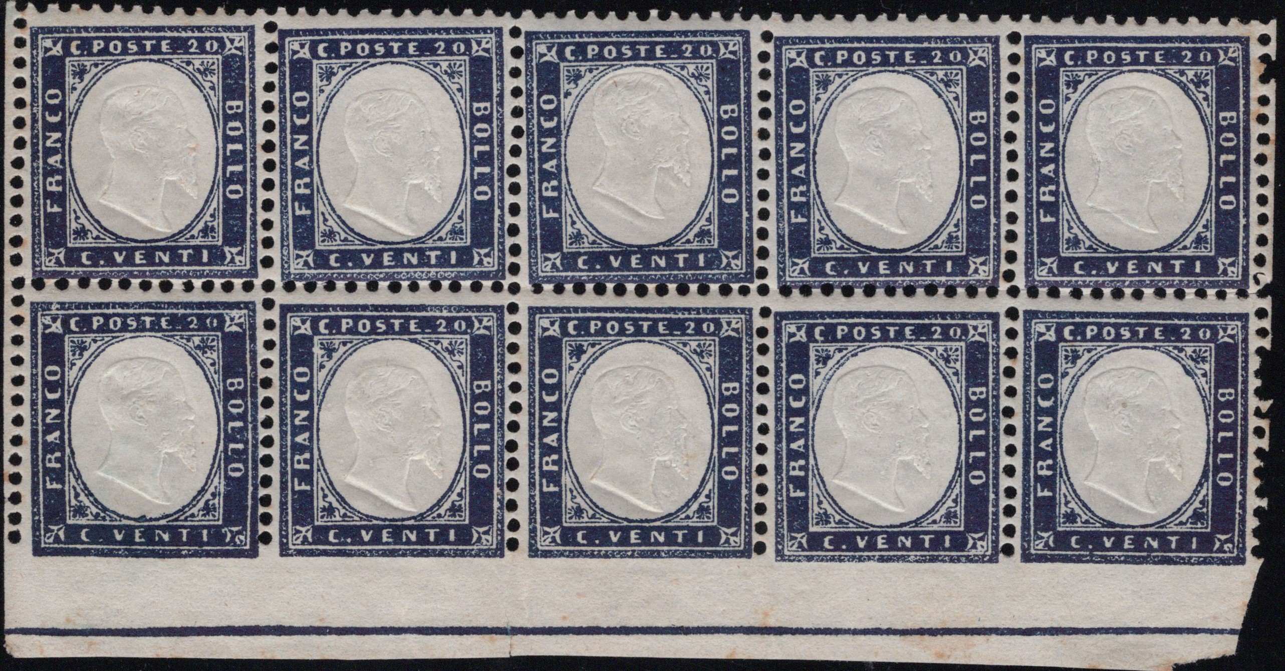 1862 - 20 cent. indaco n.2 blocco di 10 esemplari (pos. 41/45 e 46/50) bordo di foglio in basso non tosato e linea di riquadro, nuovo con gomma integra.