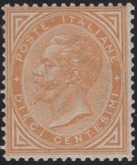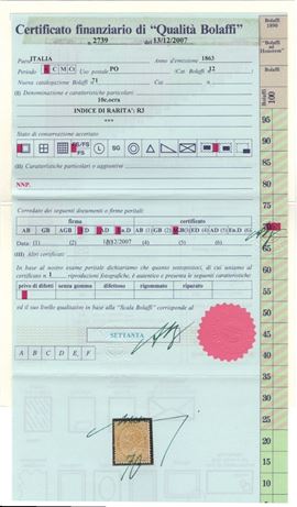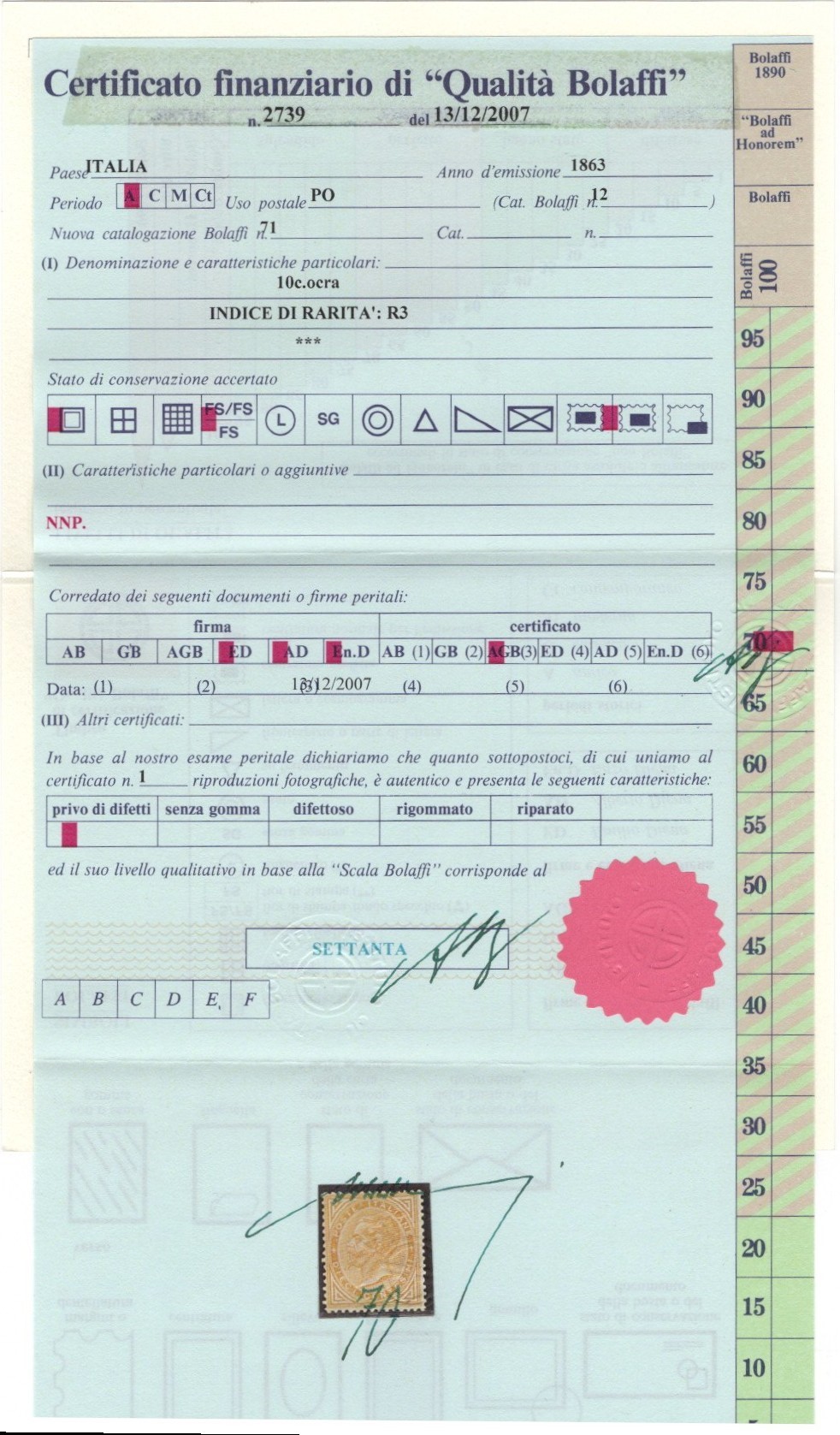 1863 - 10 cent. giallo ocra n.T17, nuovo con gomma integra e splendidamente conservato. Certificato finanziario Bolaffi, Emilio Diena.