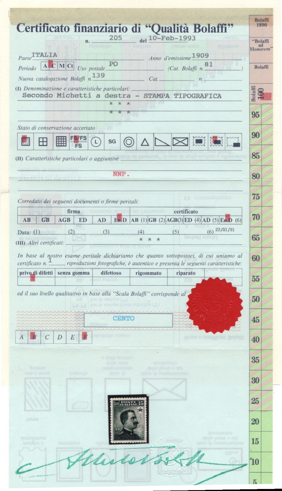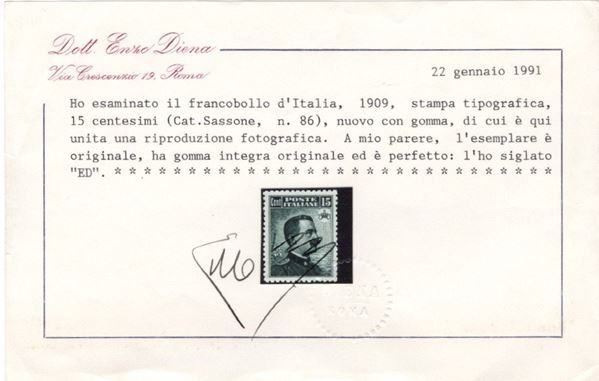 1909 - Michetti II tipo n.86 ben centrato, nuovo con gomma integra. Certificato finanziario Bolaffi 100% e certificato Enzo Diena.