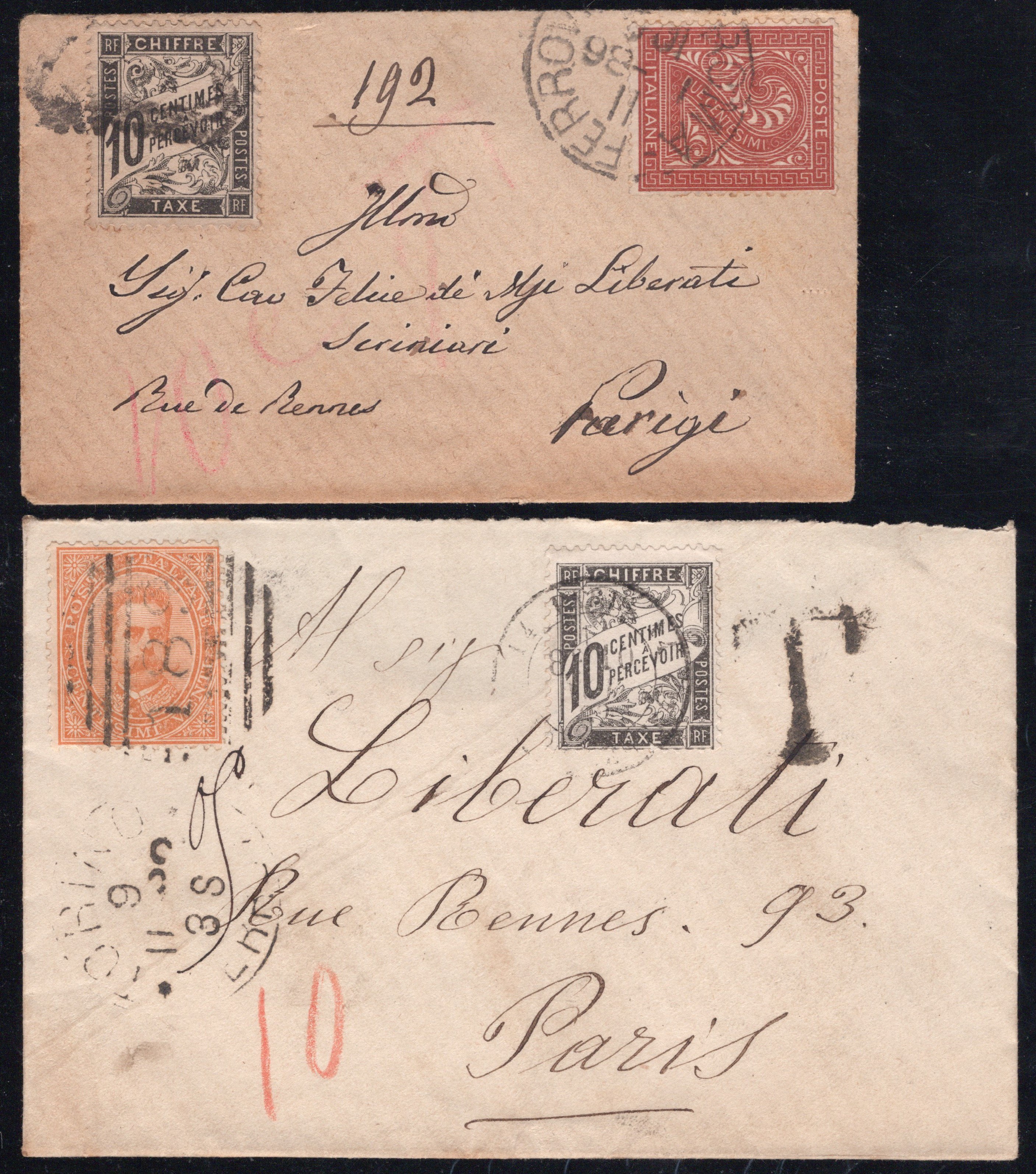 Regno - Storia Postale, due buste per la francia tassate in arrivo.